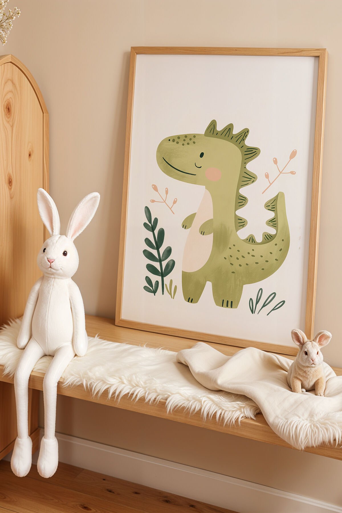 DOĞAL AHŞAP - Dinozorun Eğlenceli Dünyası – Doğal Ahşap Çerçeveli Çocuk Odası Tablosu