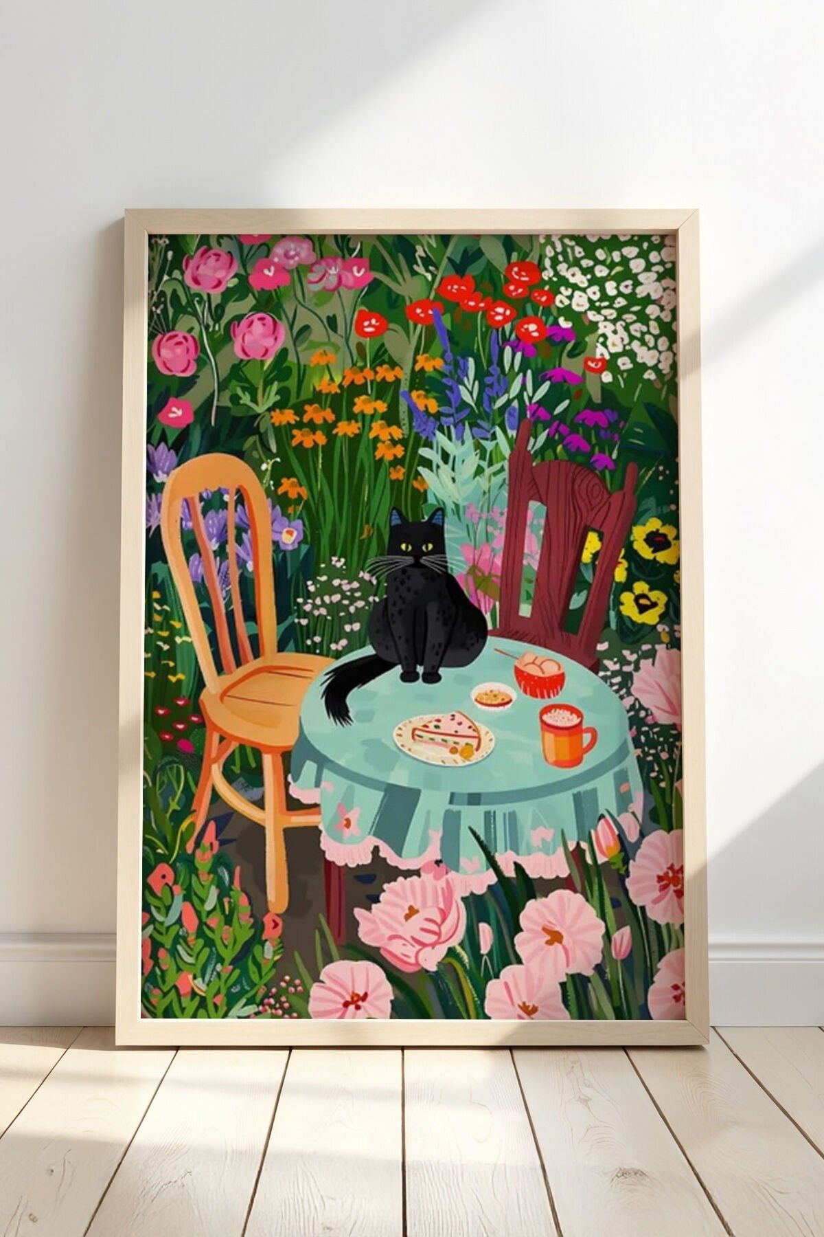 DOĞAL AHŞAP - Doğal ahşap çerçeveli Çiçekli Kedi Botanik Sanat Baskısı Duvar Tablosu