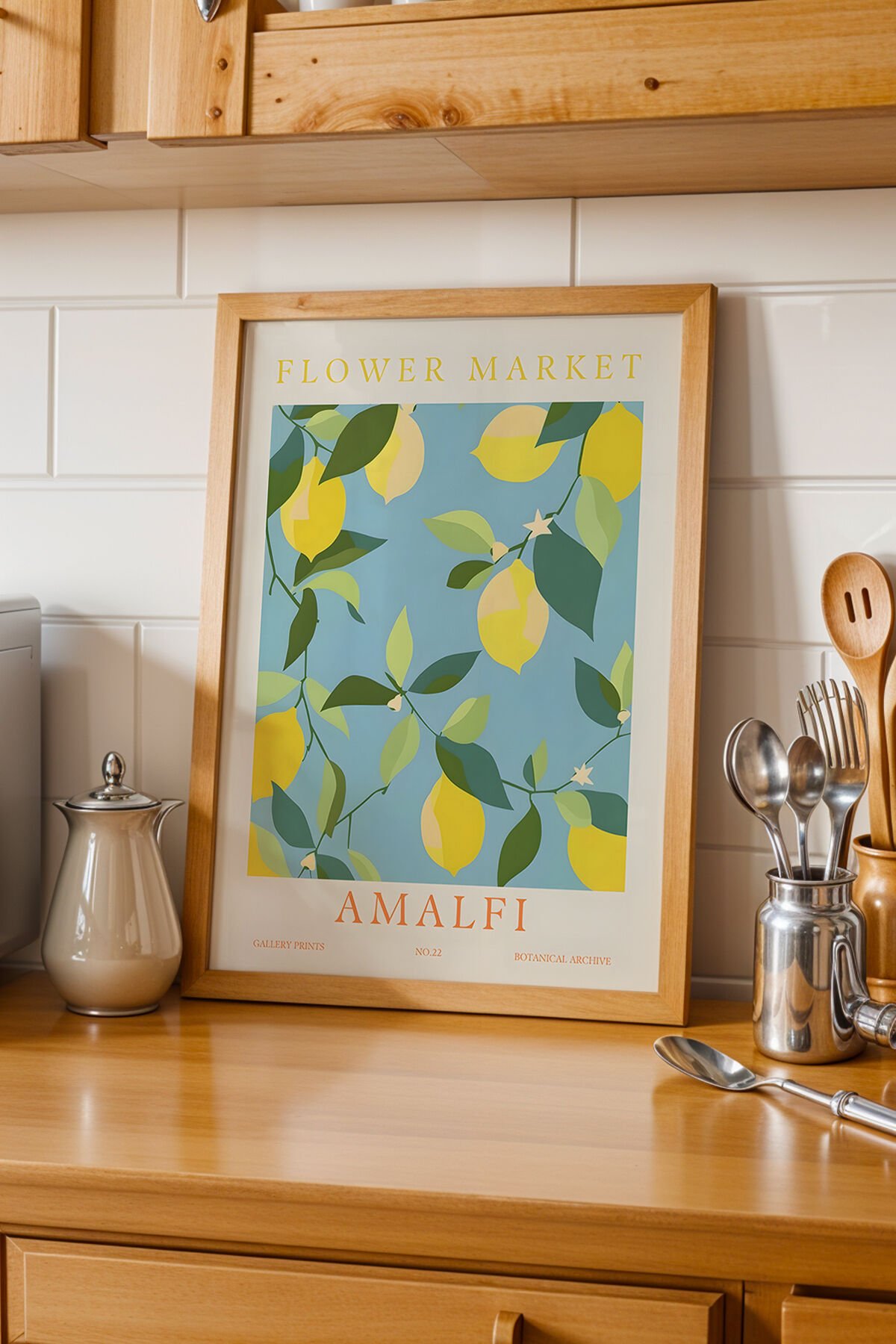 DOĞAL AHŞAP - Doğal Ahşap Çerçeveli Flower Market Amalfi Tablosu – Limon Bahçesi Sanatı