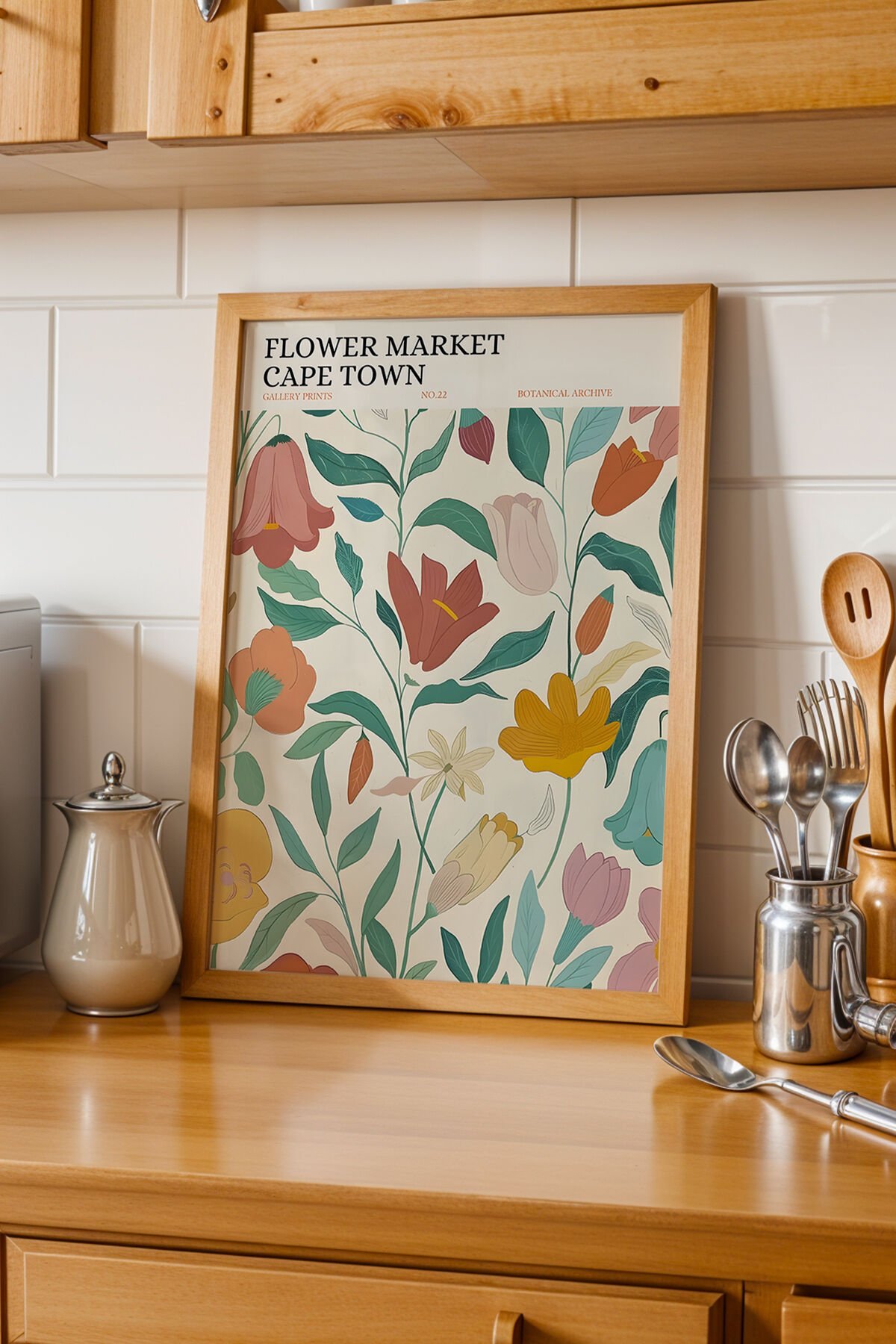 DOĞAL AHŞAP - Doğal Ahşap Çerçeveli Flower Market Cape Town Tablosu – Zarif Bahar Çiçekleri