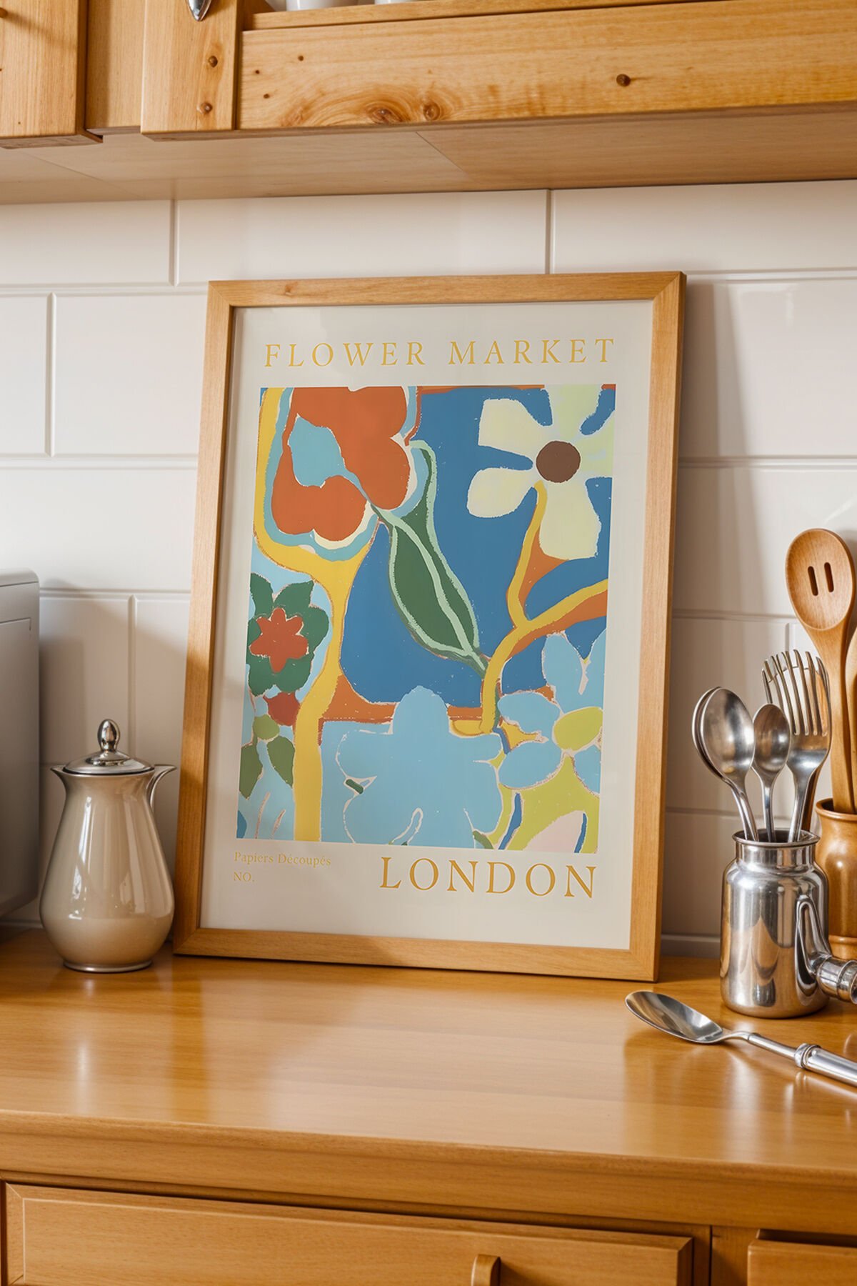 DOĞAL AHŞAP - Doğal Ahşap Çerçeveli Flower Market London Tablosu – Canlı Renklerde Soyut Çiçekler