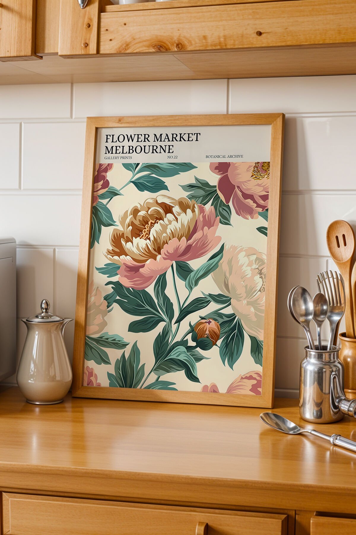 DOĞAL AHŞAP - Doğal Ahşap Çerçeveli Flower Market Melbourne Tablosu – Vintage Şakayık Çiçekleri