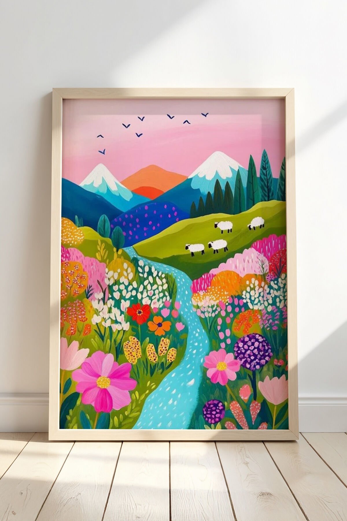 DOĞAL AHŞAP - Doğal Ahşap Çerçeveli Soyut Çiçek Bahçesi Renkli Manzara Duvar tablosu
