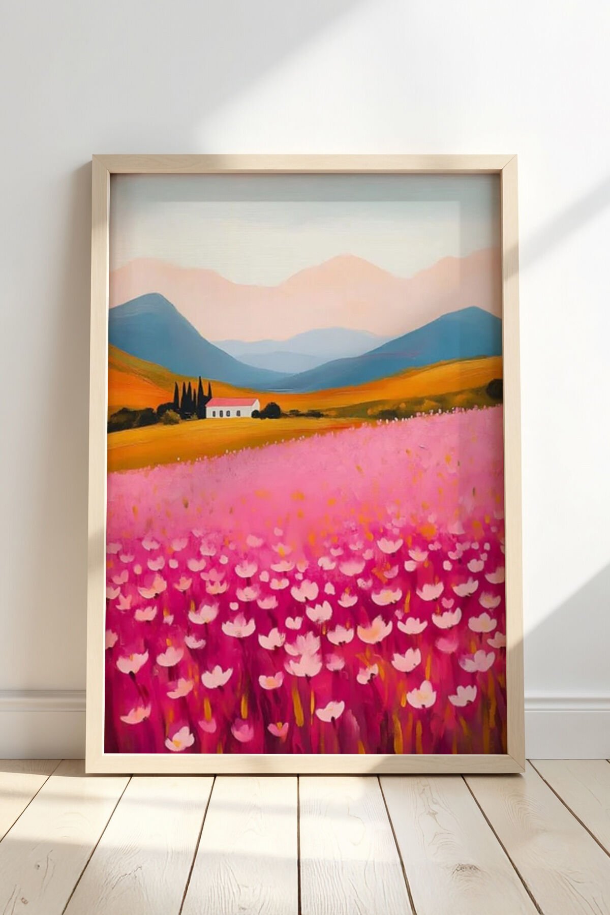 DOĞAL AHŞAP - Doğal Ahşap Çerçeveli Soyut Çiçek Bahçesi Renkli Manzara Duvar tablosu