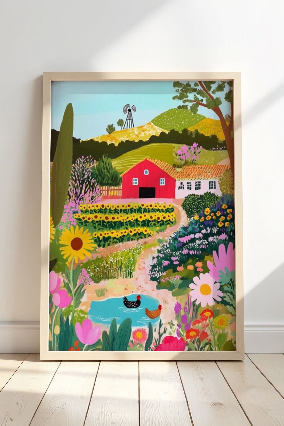 DOĞAL AHŞAP - Doğal Ahşap Çerçeveli Soyut Çiçek Bahçesi Renkli Manzara Duvar tablosu