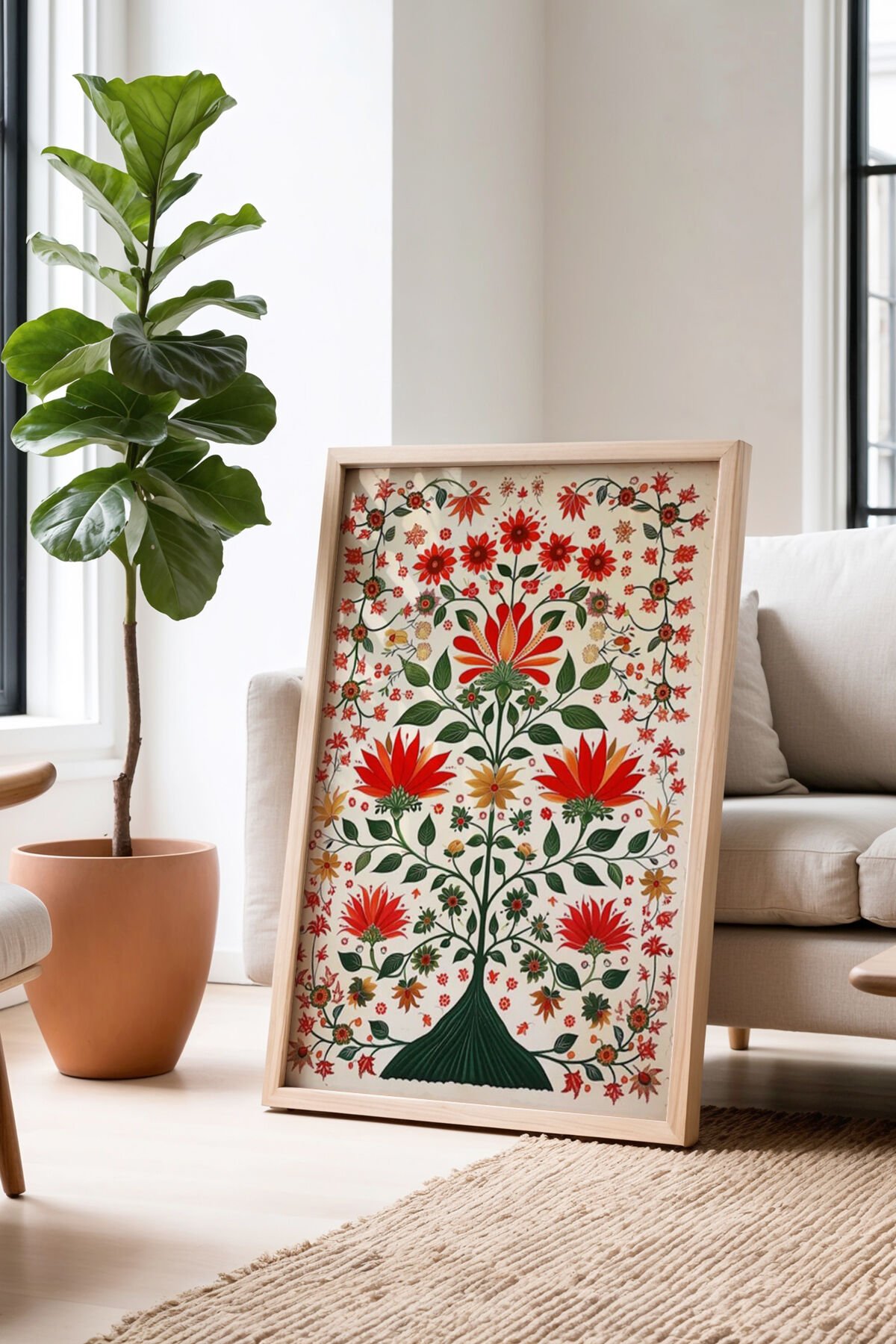 DOĞAL AHŞAP - Doğal Ahşap çerçeveli Vintage Hint Çiçek Baskısı Salon Tablosu