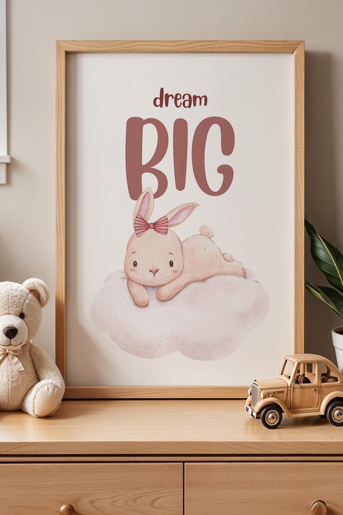 DOĞAL AHŞAP - Dream Big Yazılı Tavşan Çocuk Odası Ahşap Çerçeveli Duvar Tablosu