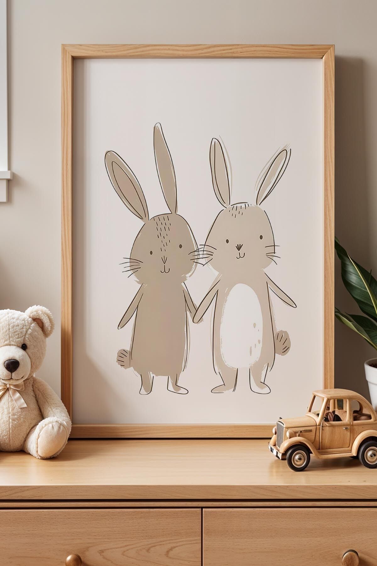 DOĞAL AHŞAP - El Ele Tutan Tavşanlar Çocuk Odası Ahşap Çerçeveli Duvar Tablosu