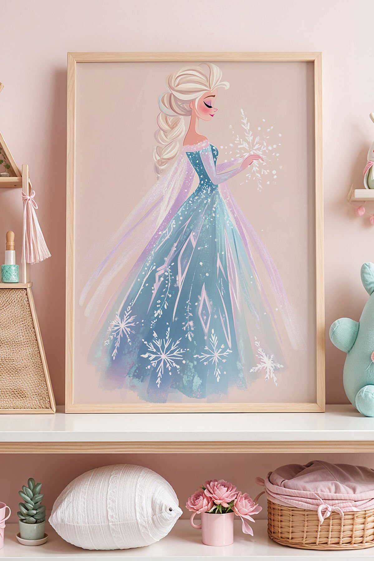 DOĞAL AHŞAP - Elsa Kar Büyüsü ve Mavi Elbise Çocuk Odası Ahşap Çerçeveli Duvar Tablosu