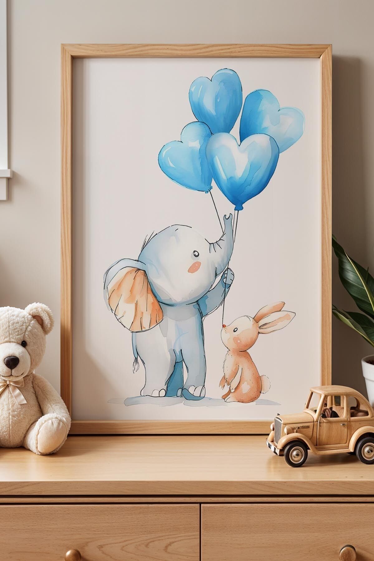 DOĞAL AHŞAP - Fil ve Tavşan Kalpli Balonlar Çocuk Odası Ahşap Çerçeveli Duvar Tablosu