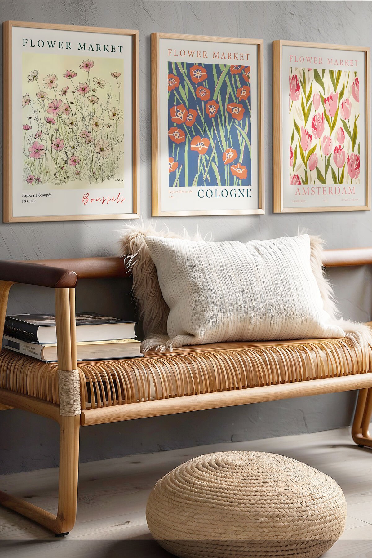 DOĞAL AHŞAP - Flower Market Brussels, Cologne, Amsterdam – Retro Tarzda Canlı Çiçek Desenli Ahşap Tablo Seti