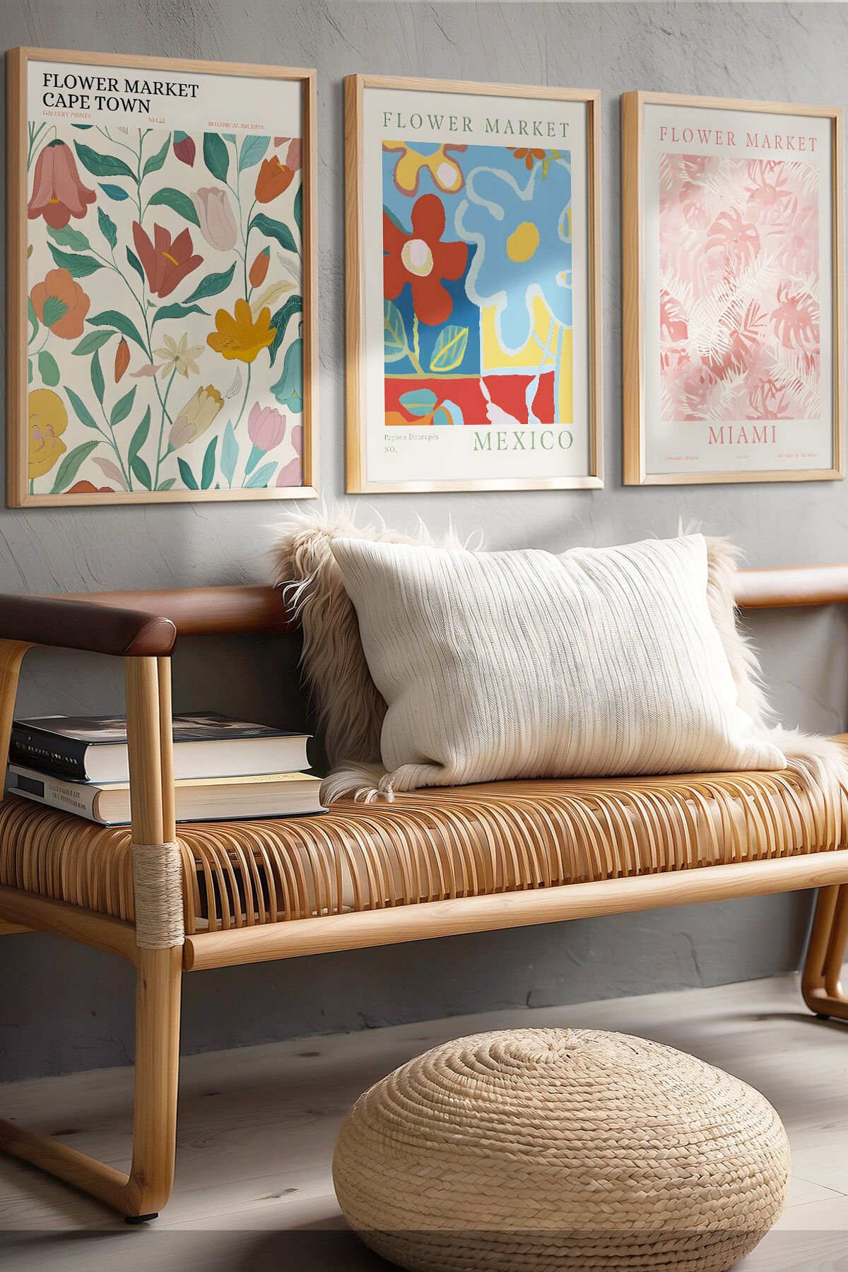 DOĞAL AHŞAP - Flower Market Cape Town, Mexico, Miami – Canlı Renklerde Çiçek Desenli Ahşap Çerçeveli Tablo Seti