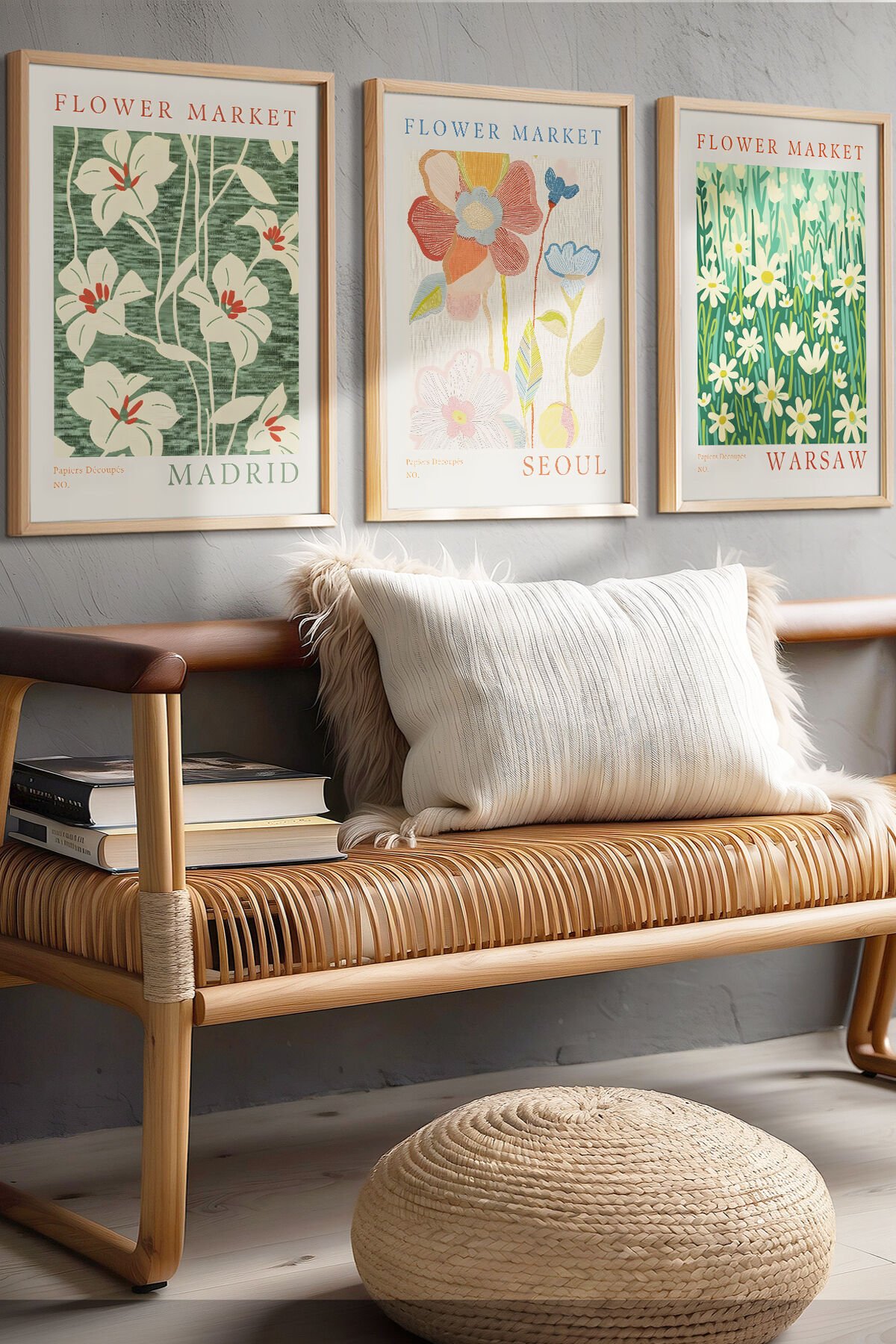 DOĞAL AHŞAP - Flower Market Madrid, Seoul, Warsaw – Doğal ve Zarif Çiçek Temalı Ahşap Çerçeveli Tablo Seti