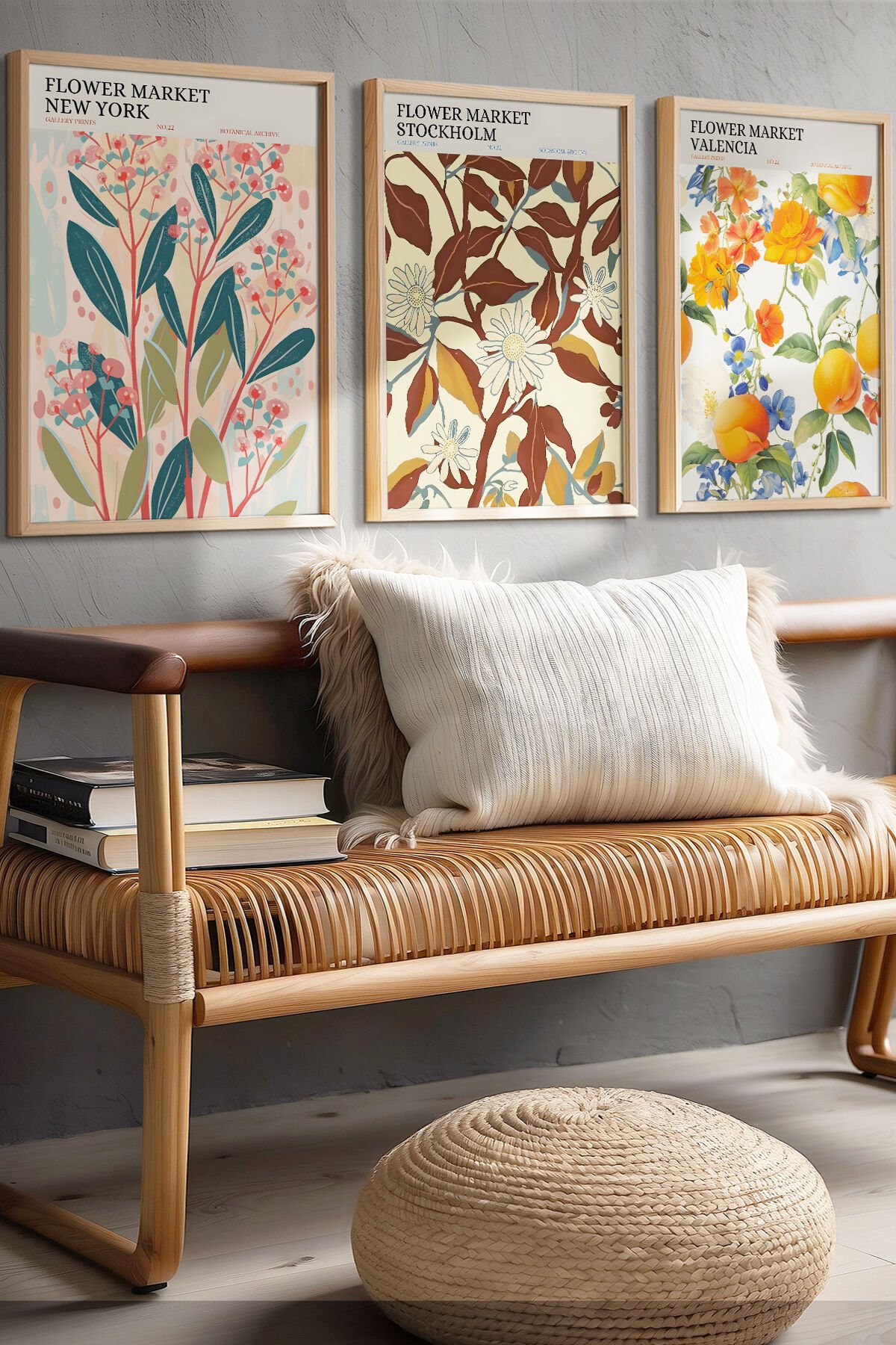 DOĞAL AHŞAP - Flower Market New York, Stockholm, Valencia – Tropikal Çiçek Desenli Ahşap Çerçeveli Tablo Seti