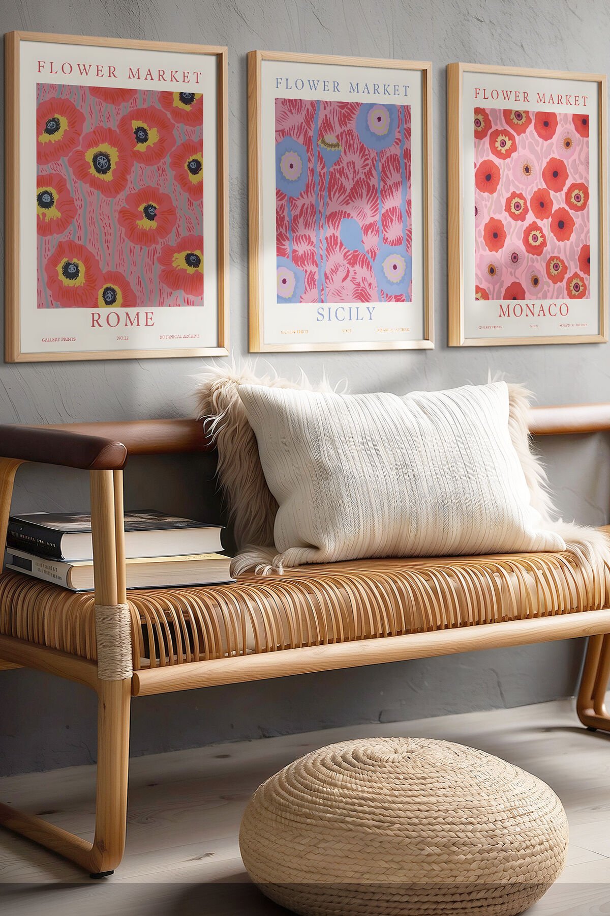 DOĞAL AHŞAP - Flower Market Rome, Sicily, Monaco Sıcak Tonlarda Vintage Çiçek Desenli Ahşap Çerçeveli Tablo Seti