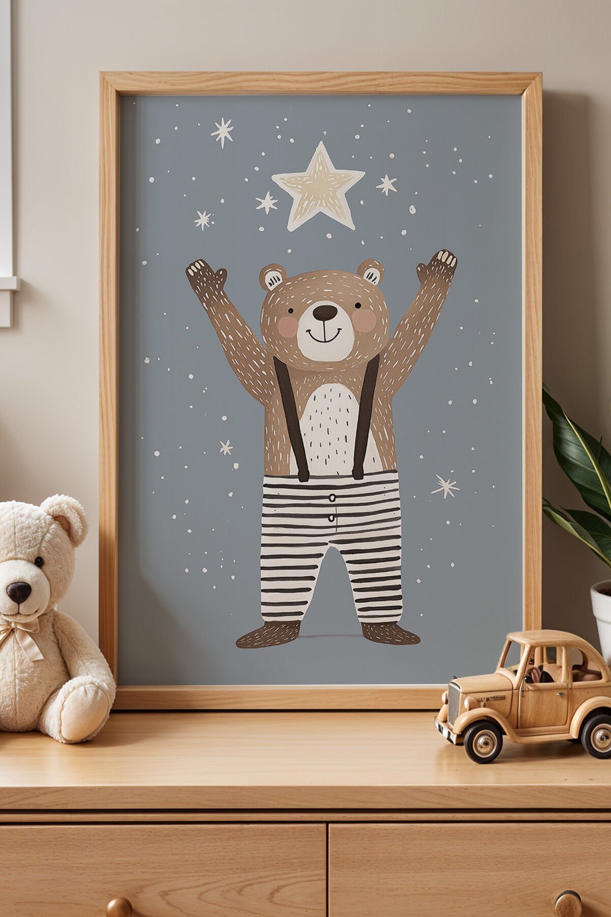 DOĞAL AHŞAP - Gece Gökyüzünde Yıldızlı Ayıcık - Doğal Ahşap Çerçeveli Çocuk ve Bebek Odası Tablosu