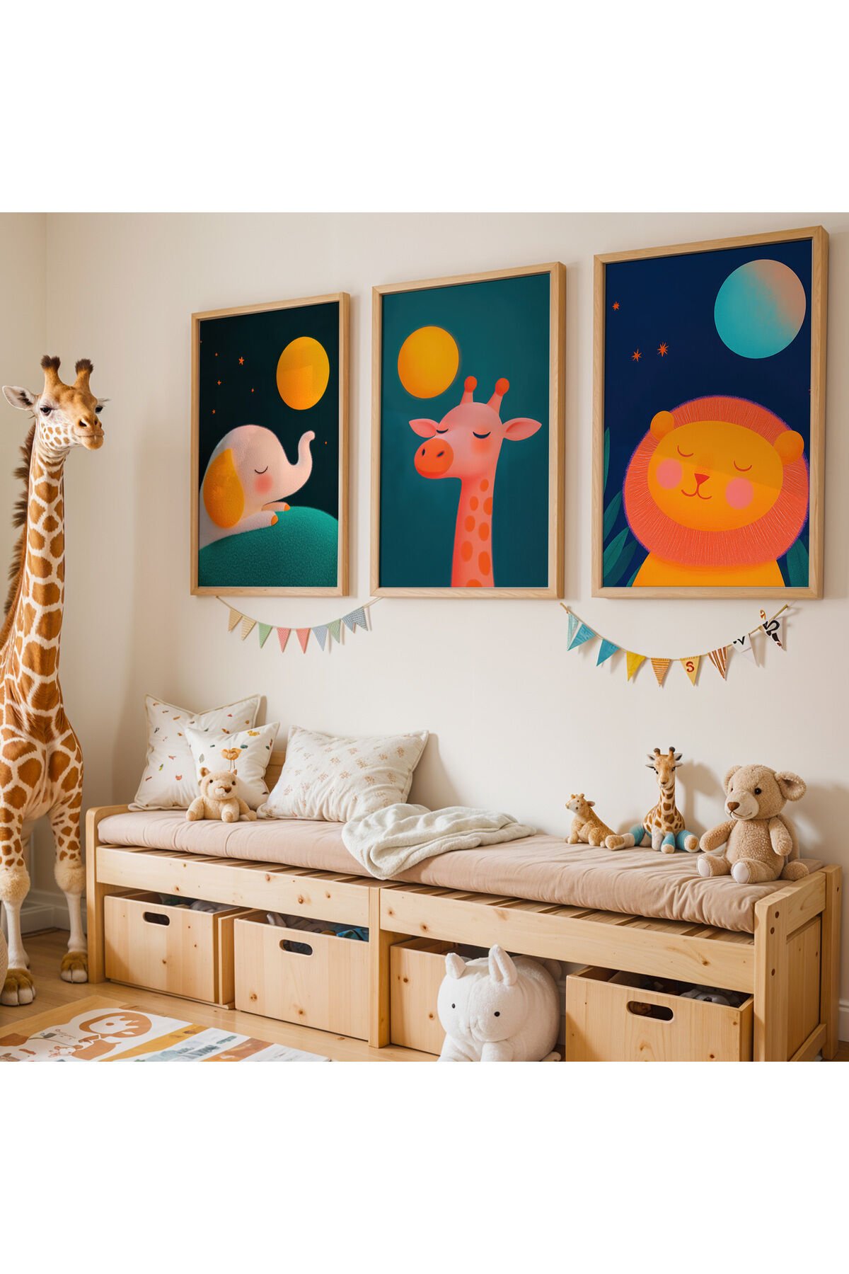 DOĞAL AHŞAP - Gece Masalı – Uykucu Fil, Zürafa ve Aslan Temalı Çocuk Odası Tablo Seti