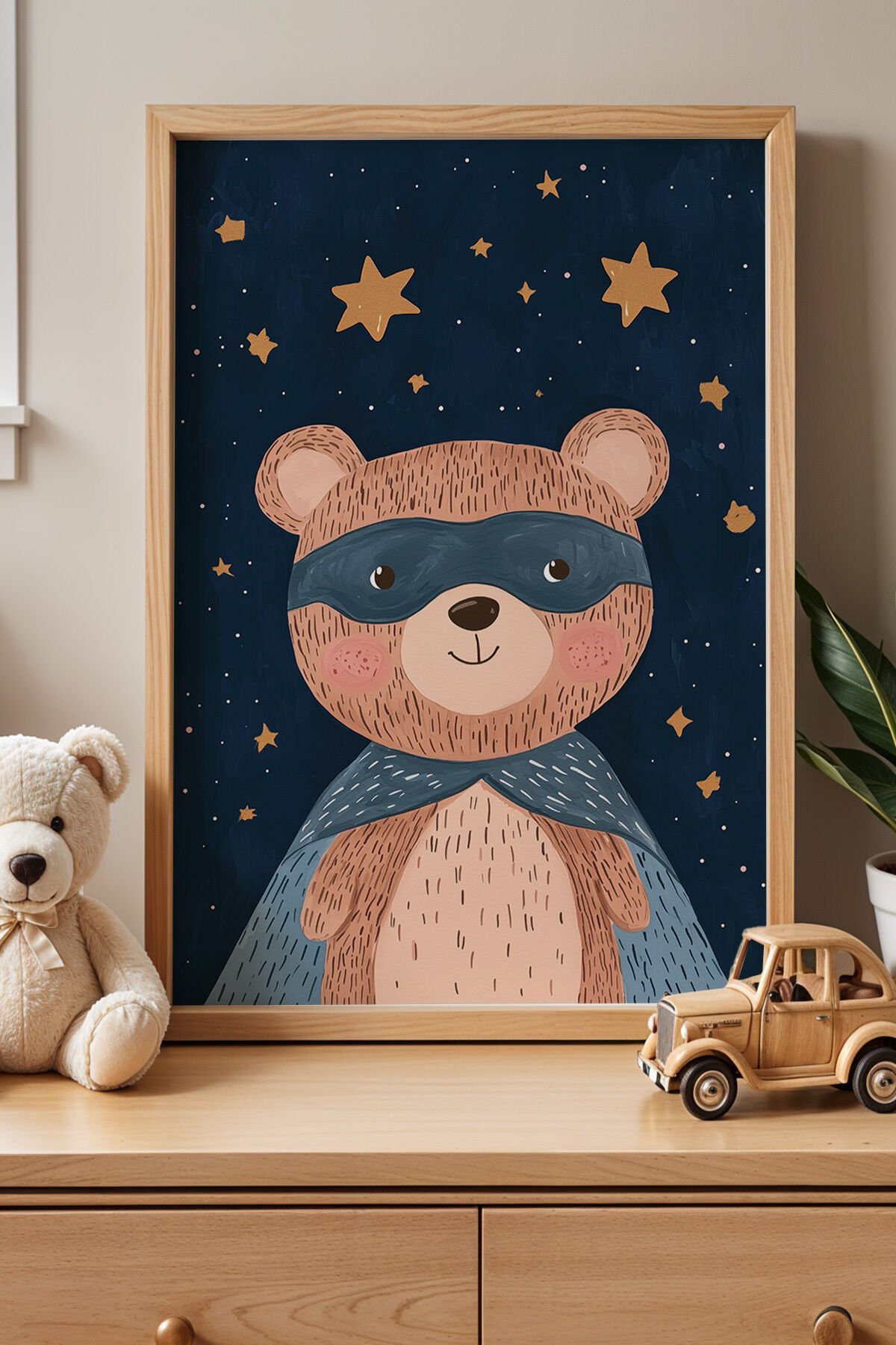 DOĞAL AHŞAP - Geceyi Aydınlatan Süper Kahraman Ayı - Doğal Ahşap Çerçeveli Çocuk ve Bebek Odası Tablosu