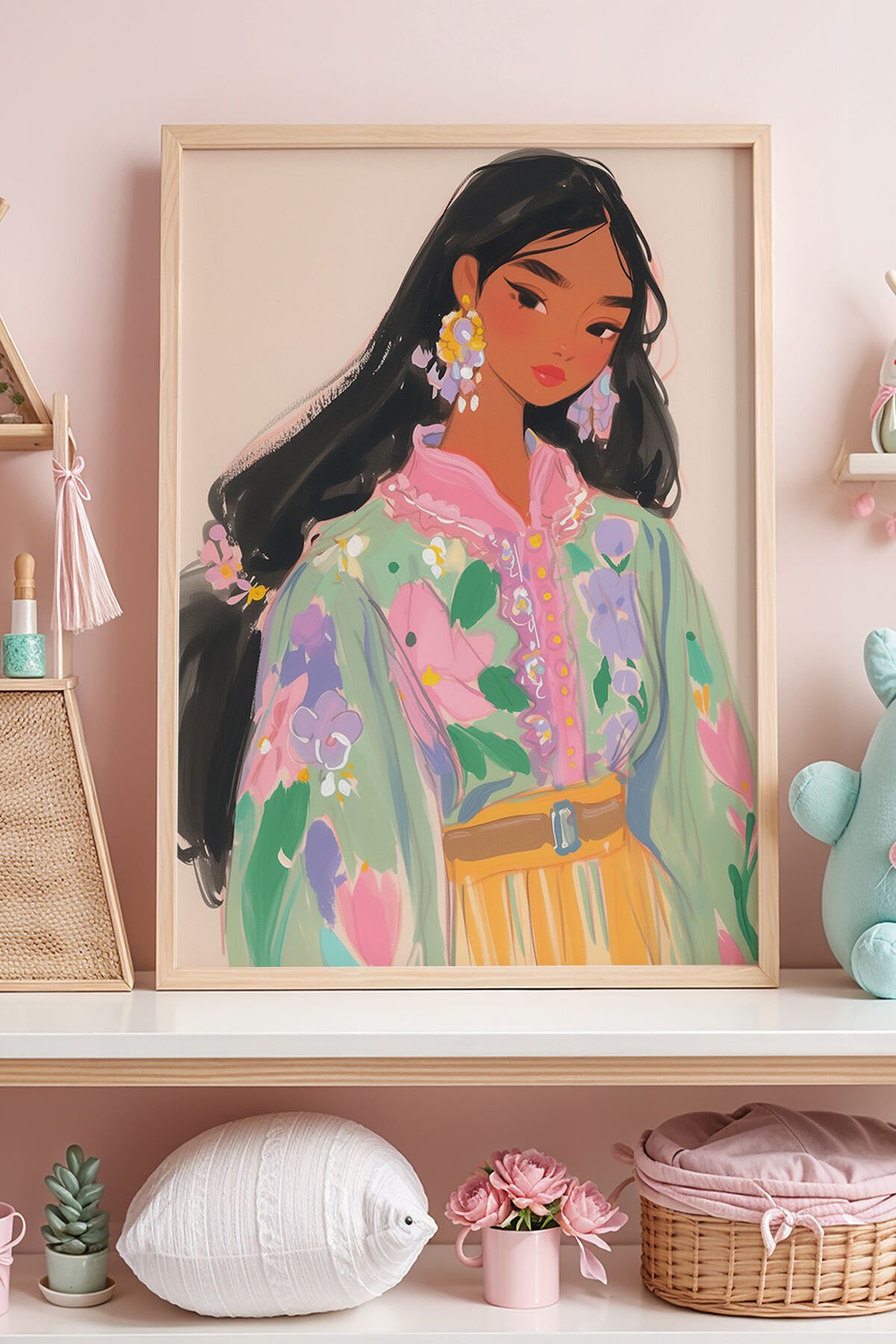 DOĞAL AHŞAP - Geleneksel Kıyafetli Pastel Renkli Kız Çocuk Odası Ahşap Çerçeveli Duvar Tablosu