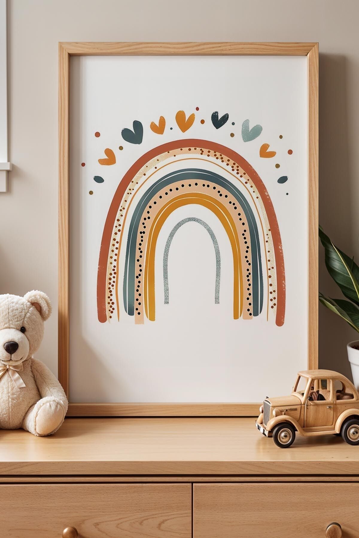 DOĞAL AHŞAP - Gökkuşağı ve Kalpler İllüstrasyonu Çocuk Odası Ahşap Çerçeveli Duvar Tablosu