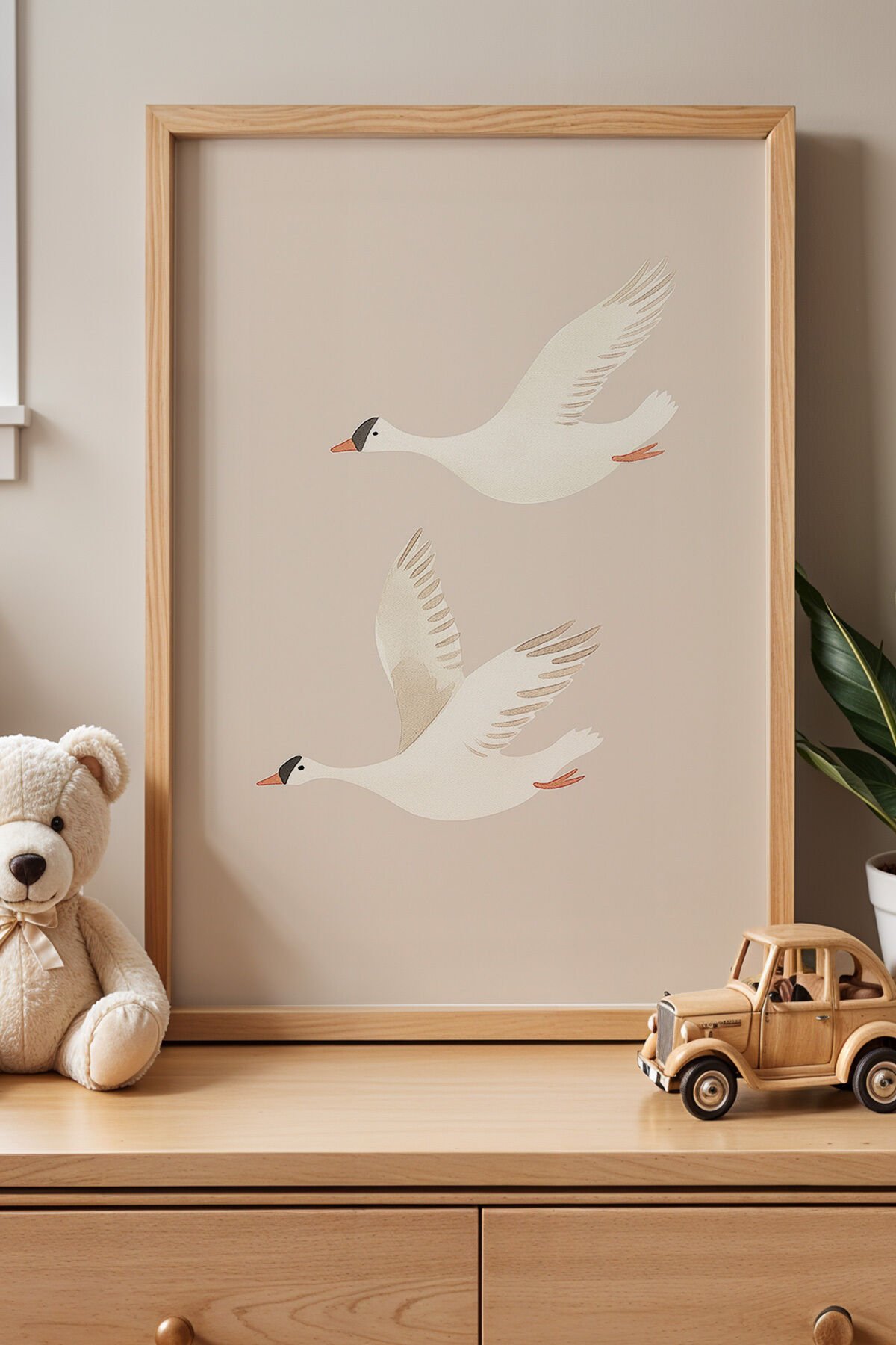 DOĞAL AHŞAP - Gökyüzünde Uçan Beyaz Kuğular - Doğal Ahşap Çerçeveli Çocuk Odası ve Bebek Odası Tablosu