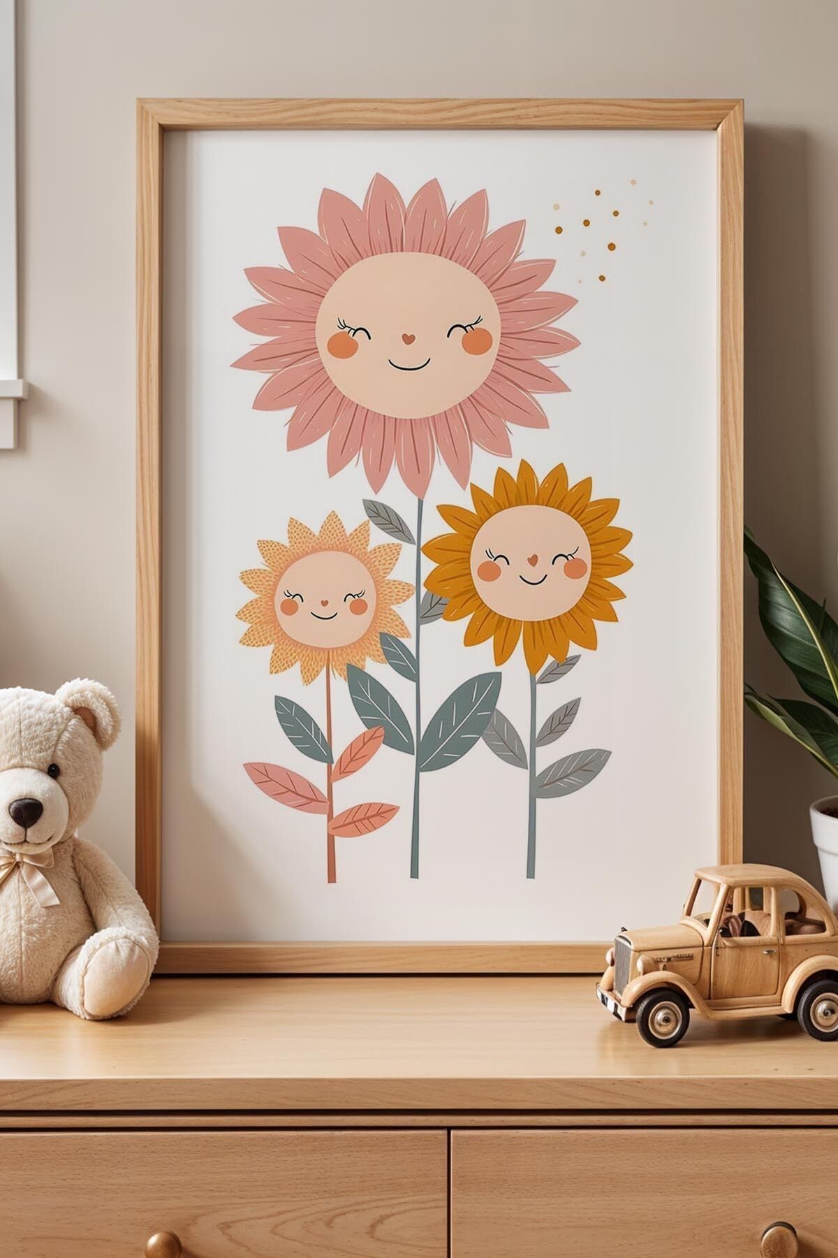 DOĞAL AHŞAP - Gülümseyen Papatyalar Çocuk Odası Ahşap Çerçeveli Duvar Tablosu