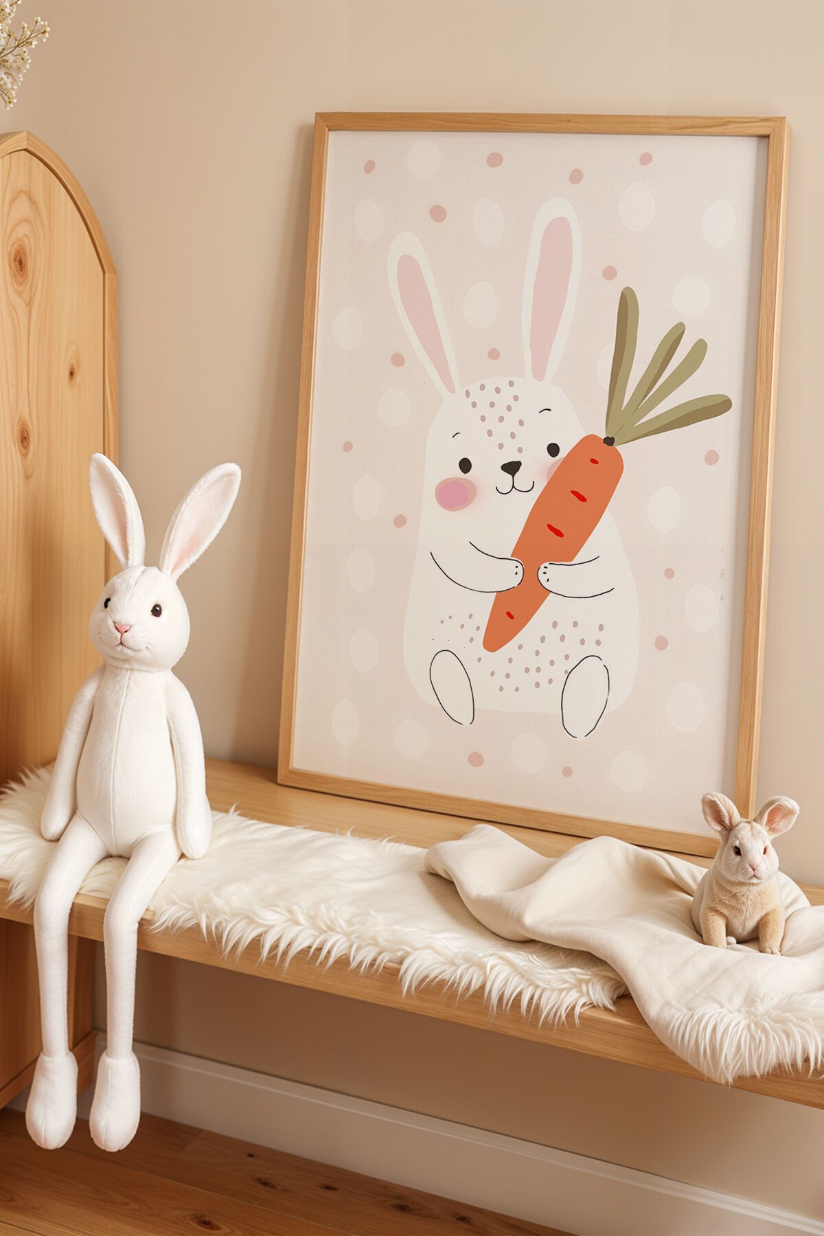 DOĞAL AHŞAP - Havuç Tutan Sevimli Tavşan - Doğal Ahşap Çerçeveli Çocuk ve Bebek Odası Tablosu