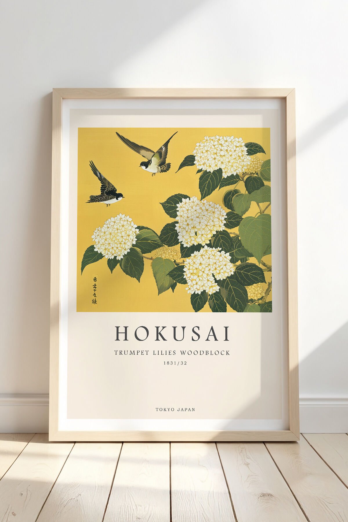 DOĞAL AHŞAP - Hokusai Çiçek ve Kuş Ahşap Baskı Doğal Ahşap Çerçeveli Duvar Tablosu