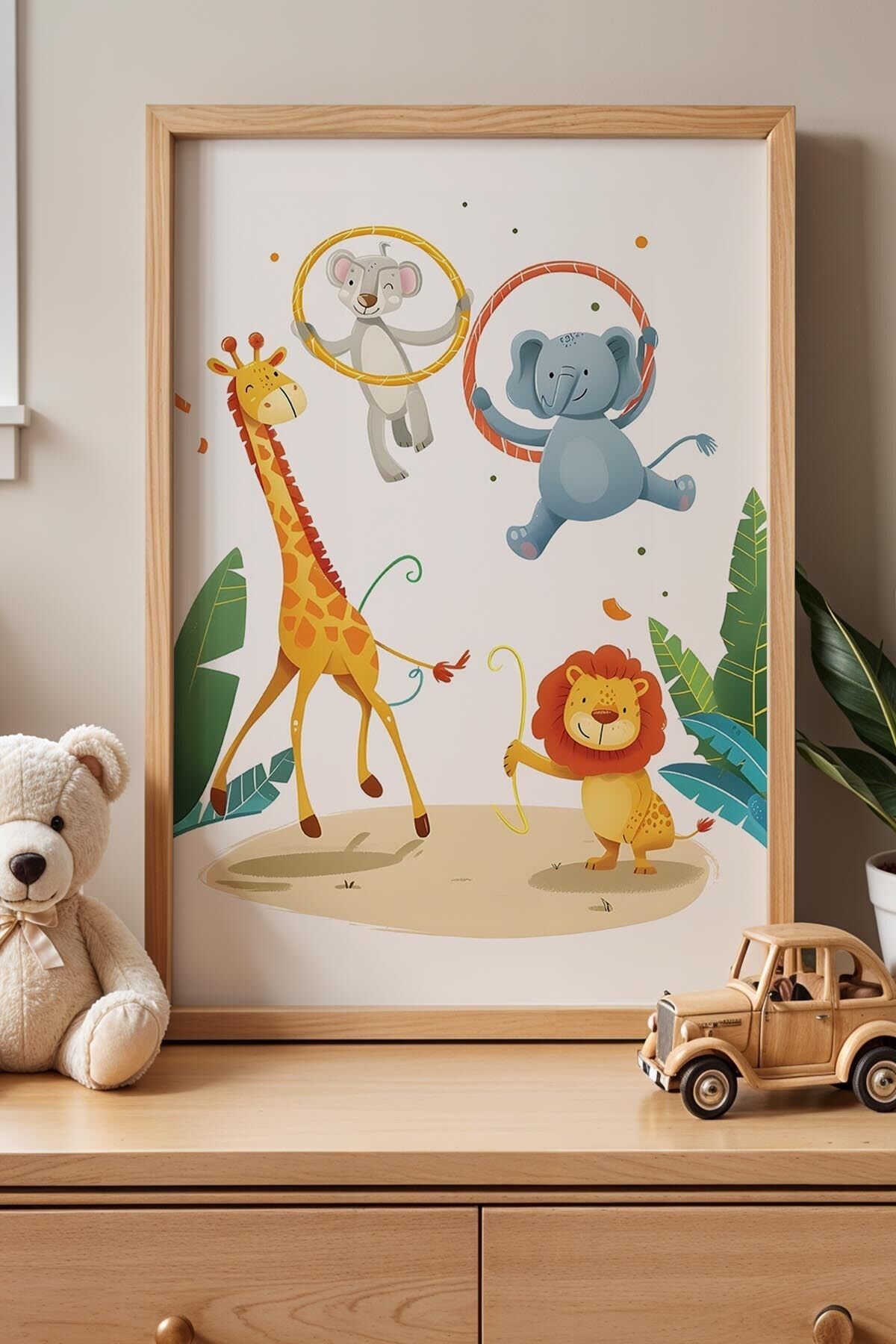 DOĞAL AHŞAP - Hulahopla Oynayan Sevimli Hayvanlar Çocuk Odası Ahşap Çerçeveli Duvar Tablosu