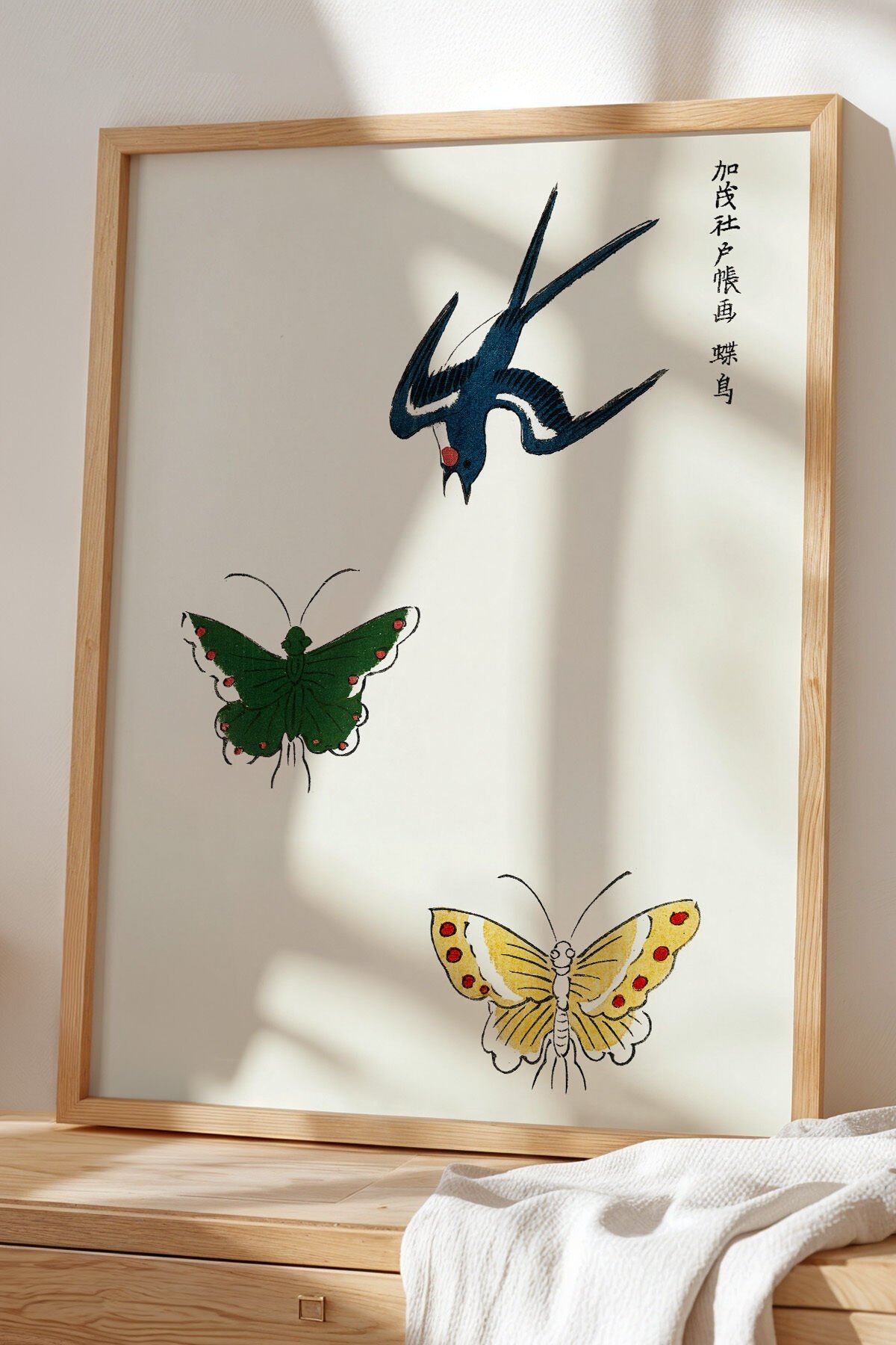 DOĞAL AHŞAP - Japandi Serisi Doğal Ahşap Çerçeveli Tablo – Zarif Kuş ve Doğa Dokunuşu
