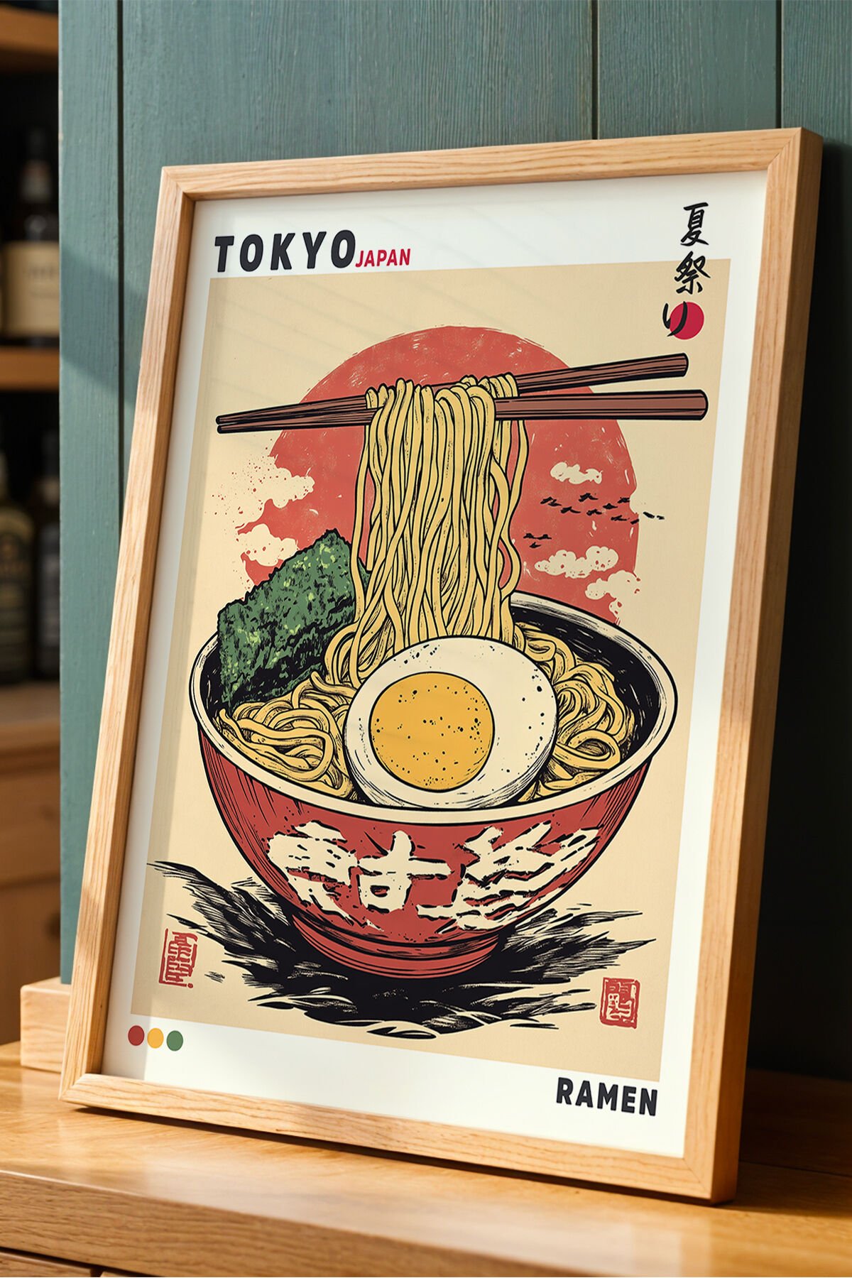 DOĞAL AHŞAP - Japon Ramen Noodle Sanatı Vintage Doğal Ahşap Çerçeveli Mutfak Duvar Tablosu