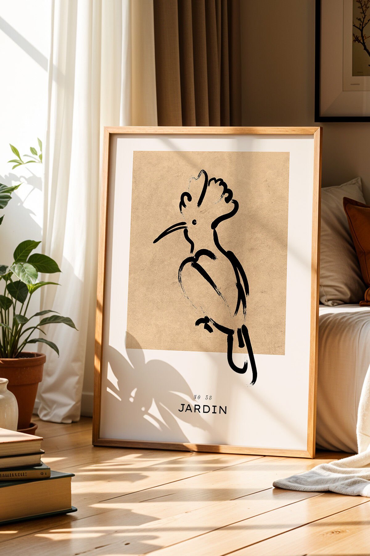 DOĞAL AHŞAP - Jardin Serisi Kuş Çizimi Bohem Kahverengi Doğal Ahşap Çerçeveli Duvar Tablosu