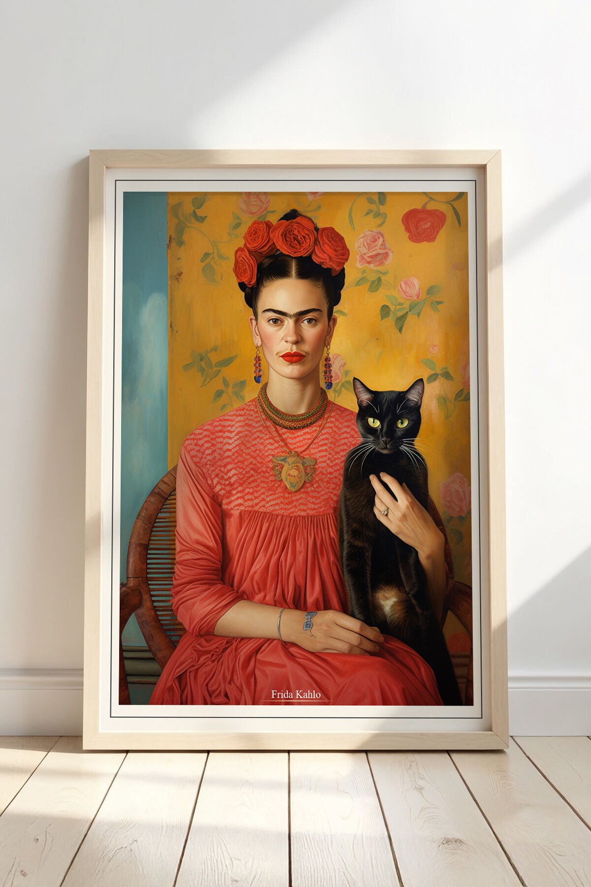 DOĞAL AHŞAP - Kahlo Stili Siyah Kedi Portresi Doğal Ahşap Çerçeveli Duvar Tablosu