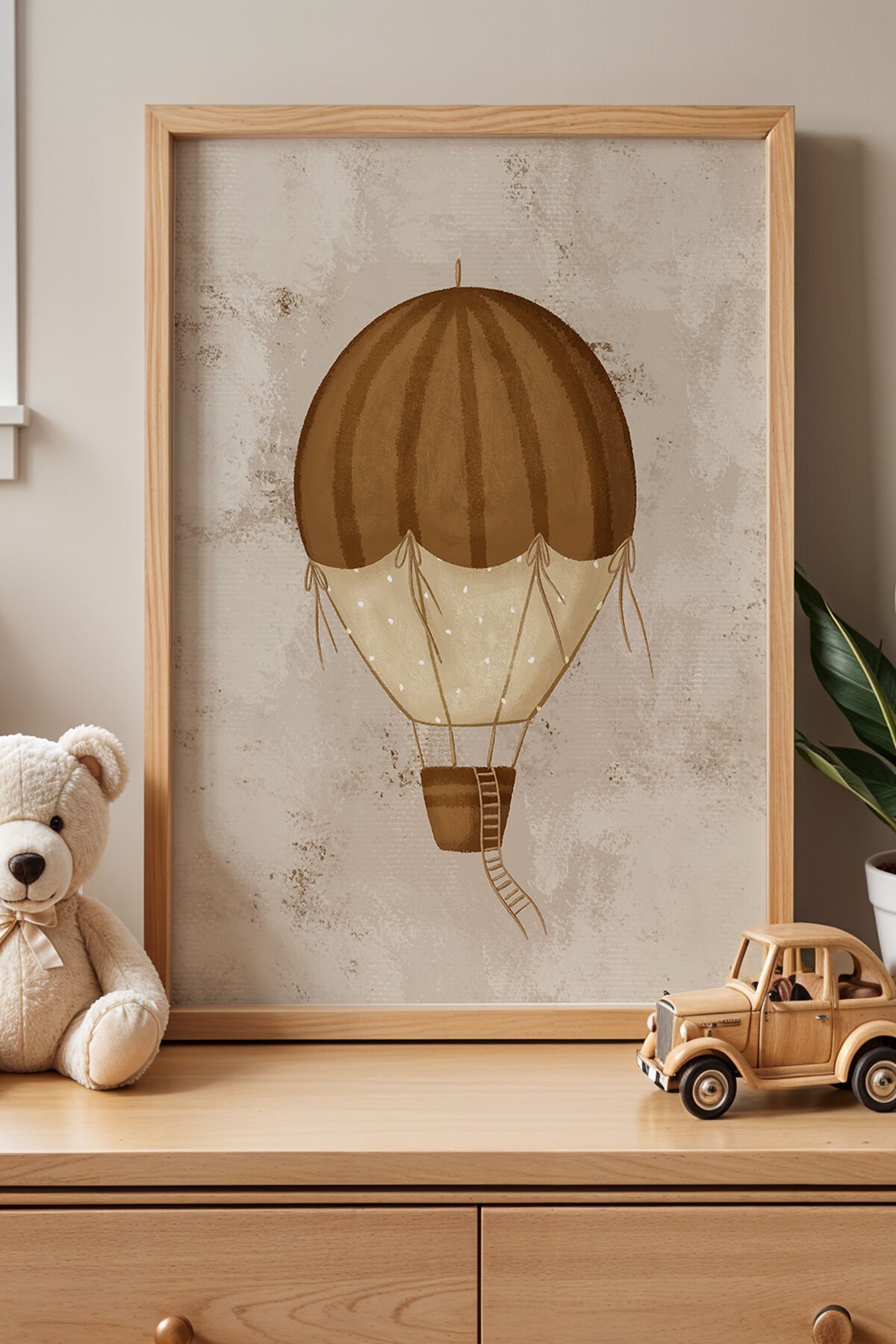 DOĞAL AHŞAP - Kahverengi Uçan Balon Çocuk Odası Ahşap Çerçeveli Duvar Tablosu
