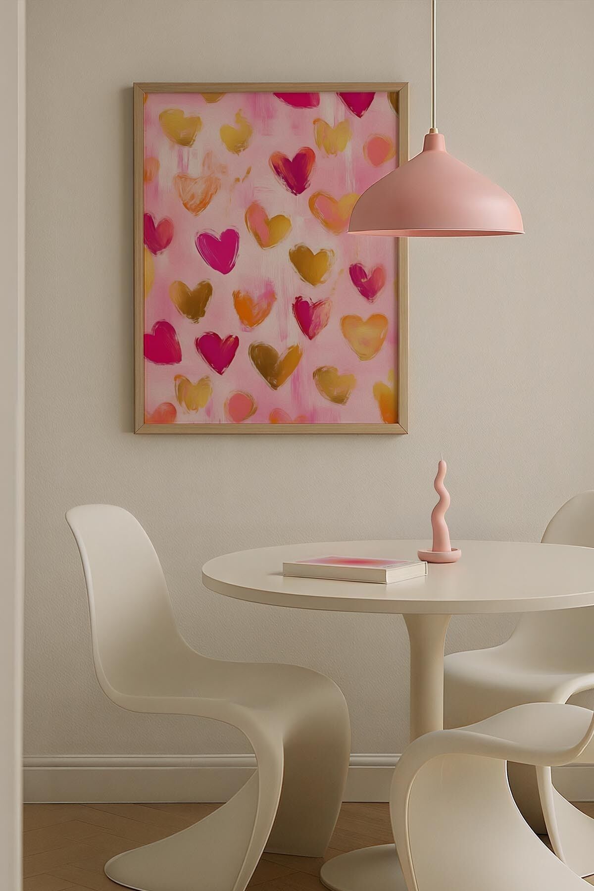 DOĞAL AHŞAP - Kalpli Desen Soft Renk Trendy Maksimalist Sanatı Ahşap Çerçeveli Duvar Tablosu