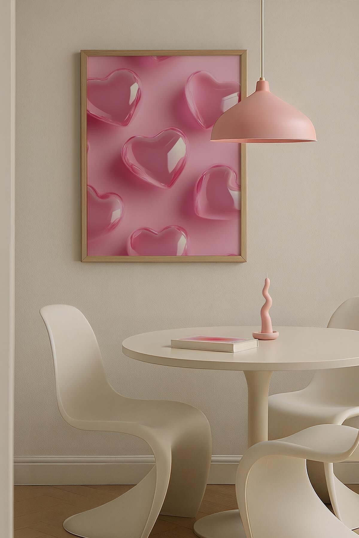 DOĞAL AHŞAP - Kalpli Doku Pembe Maksimalist Sanatı Ahşap Çerçeveli Duvar Tablosu