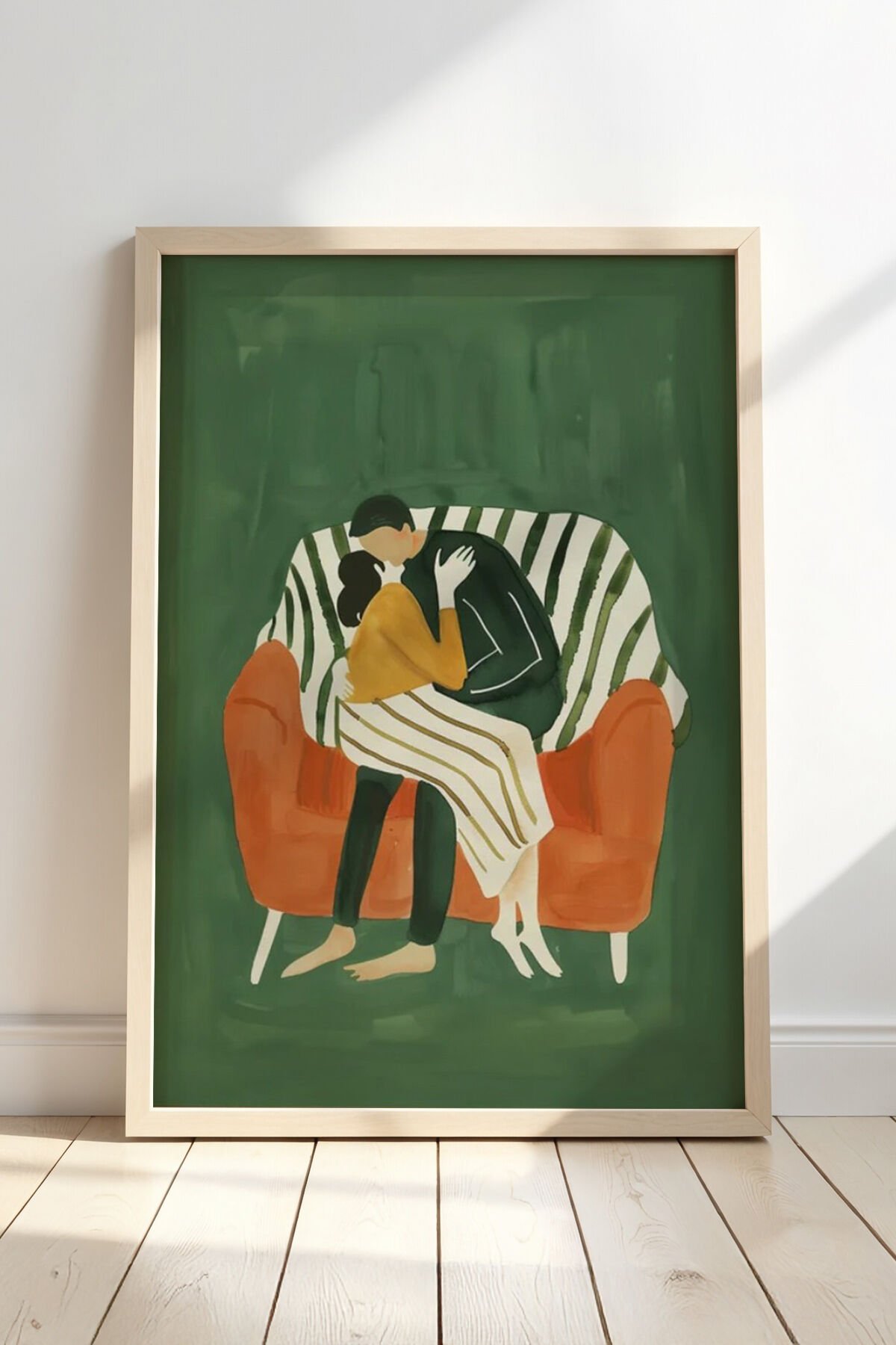 DOĞAL AHŞAP - Kanepede romantik çift baskısı Ahşap Çerçeveli Duvar Tablosu