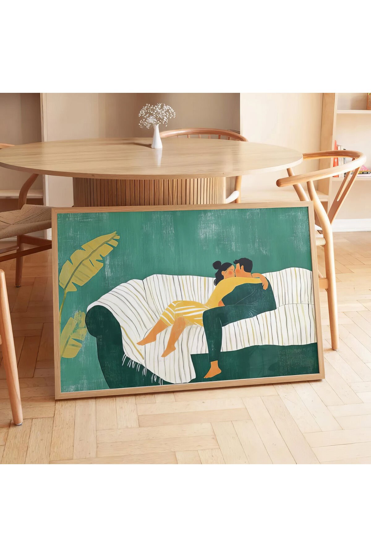 DOĞAL AHŞAP - Kanepede romantik çift baskısı Ahşap Çerçeveli Yatak Odası Duvar Tablosu