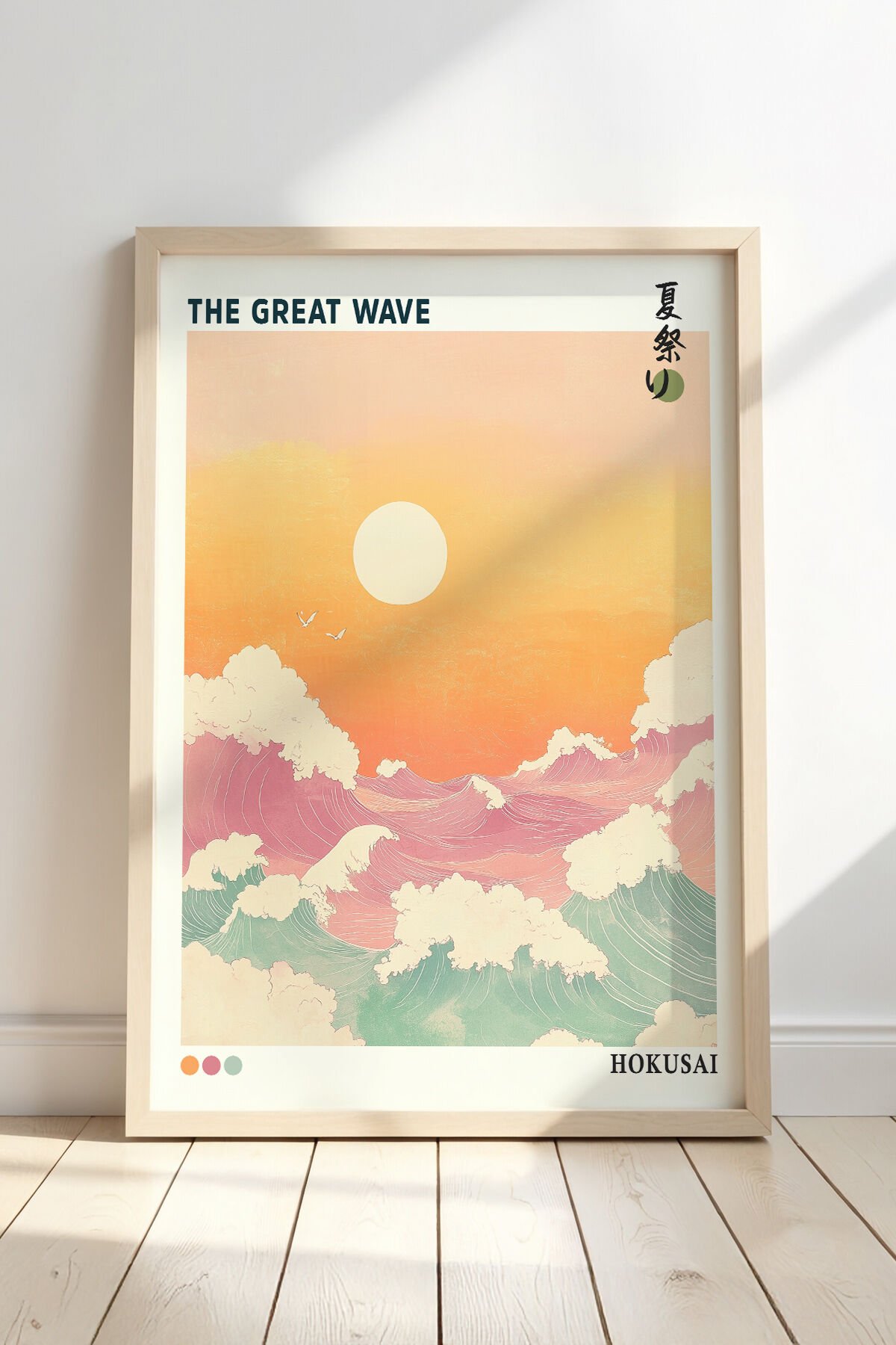 DOĞAL AHŞAP - Katsushika Hokusa Büyük Dalga I Japon Duvar Sanatı Vintage Doğal Ahşap Çerçeveli Tablo