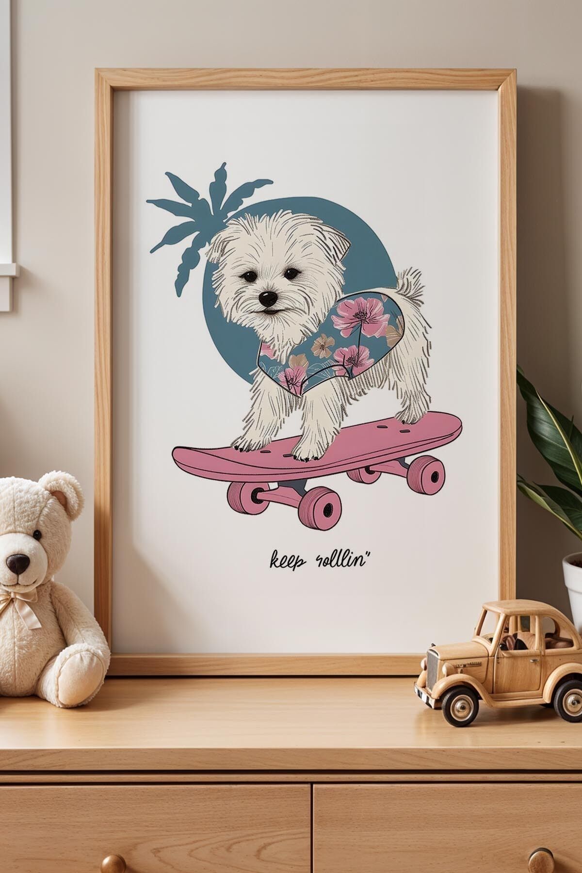 DOĞAL AHŞAP - Kaykay Üzerinde Köpek ve Palmiye Çocuk Odası Ahşap Çerçeveli Duvar Tablosu