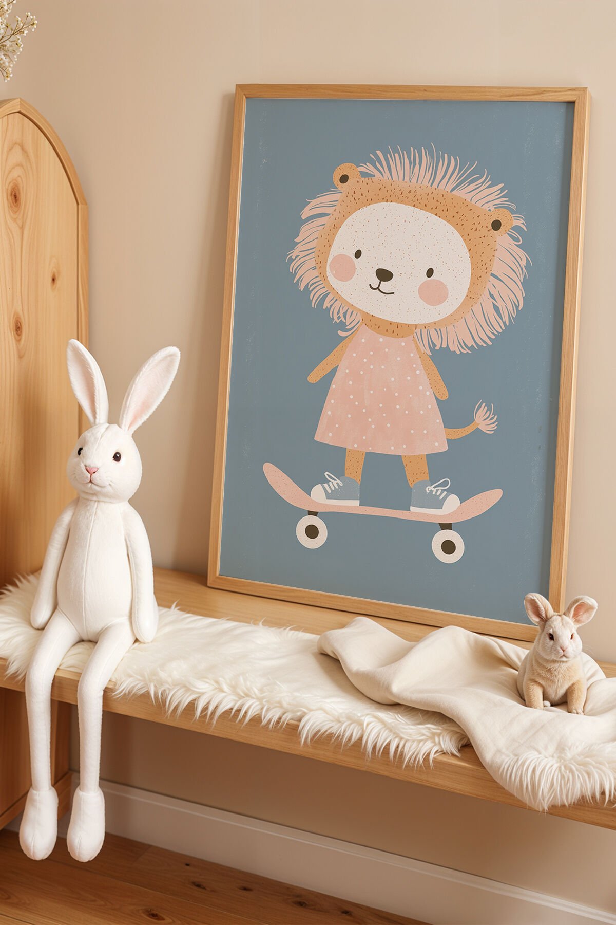 DOĞAL AHŞAP - Kaykaycı Aslan Doğal Ahşap Çerçeveli Çocuk Odası Tablosu