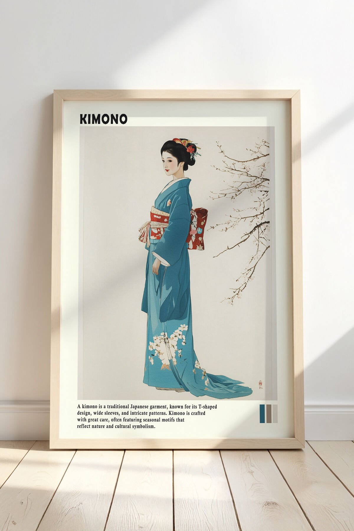 DOĞAL AHŞAP - Kimono Giyen Geisha ve Sakura Geleneksel Japon Kültürü Doğal Ahşap Çerçeveli Tablo