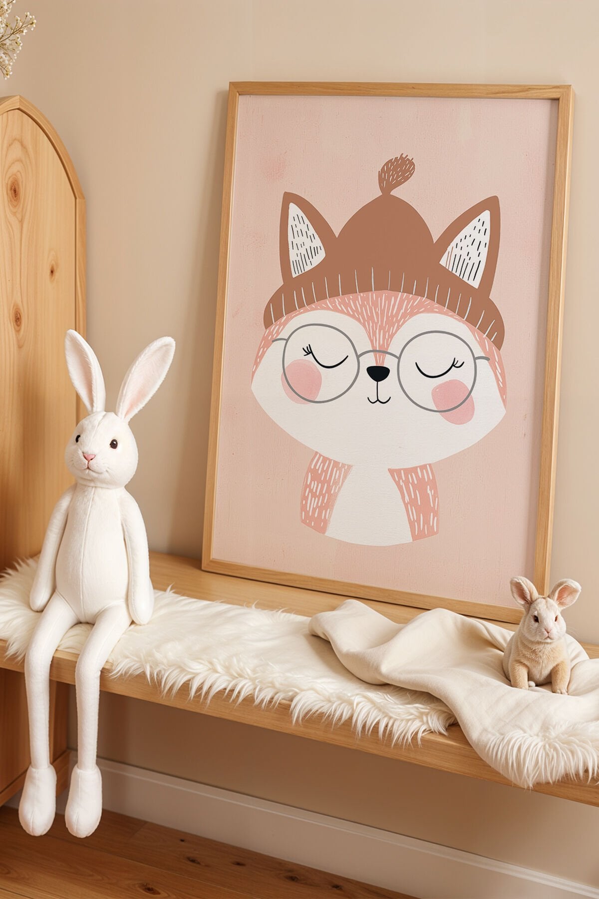 DOĞAL AHŞAP - Kışlık Şapkalı Sevimli Tilki - Doğal Ahşap Çerçeveli Çocuk ve Bebek Odası Tablosu