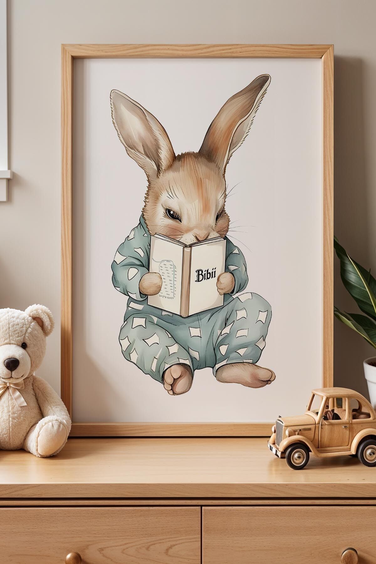 DOĞAL AHŞAP - Kitap Okuyan Pijamalı Tavşan Çocuk Odası Ahşap Çerçeveli Duvar Tablosu