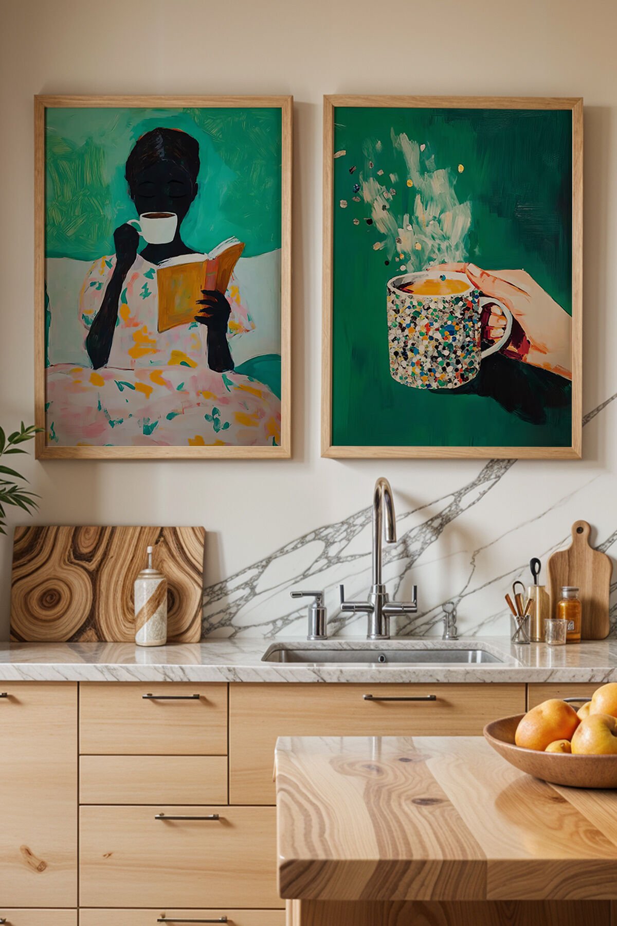 DOĞAL AHŞAP - Kitap ve Kahve Keyfi Yeşil Arka Plan 2'li Doğal Ahşap Çerçeveli Mutfak Duvar Tablosu