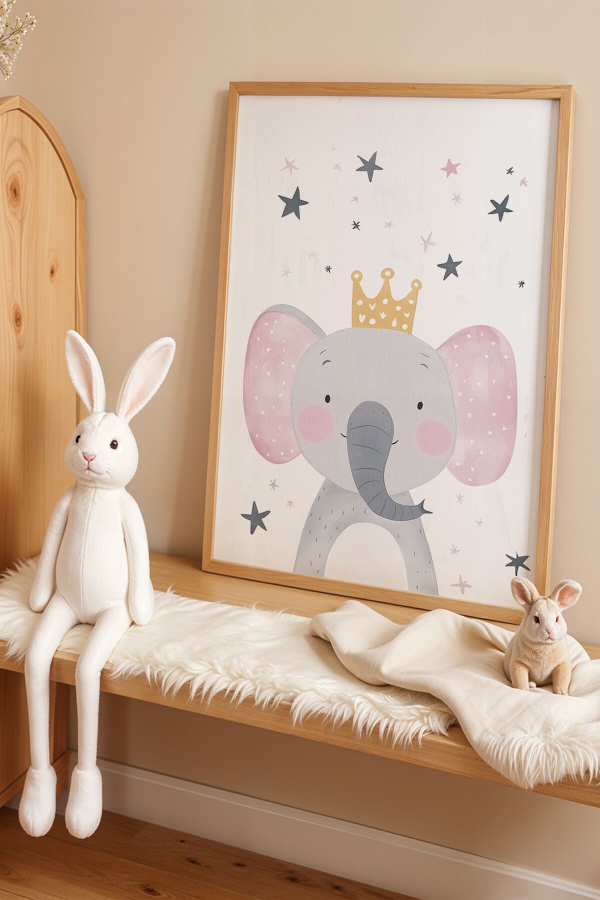 DOĞAL AHŞAP - Kraliyet Tacı Takmış Fil Doğal Ahşap Çerçeveli Çocuk ve Bebek Odası Tablosu