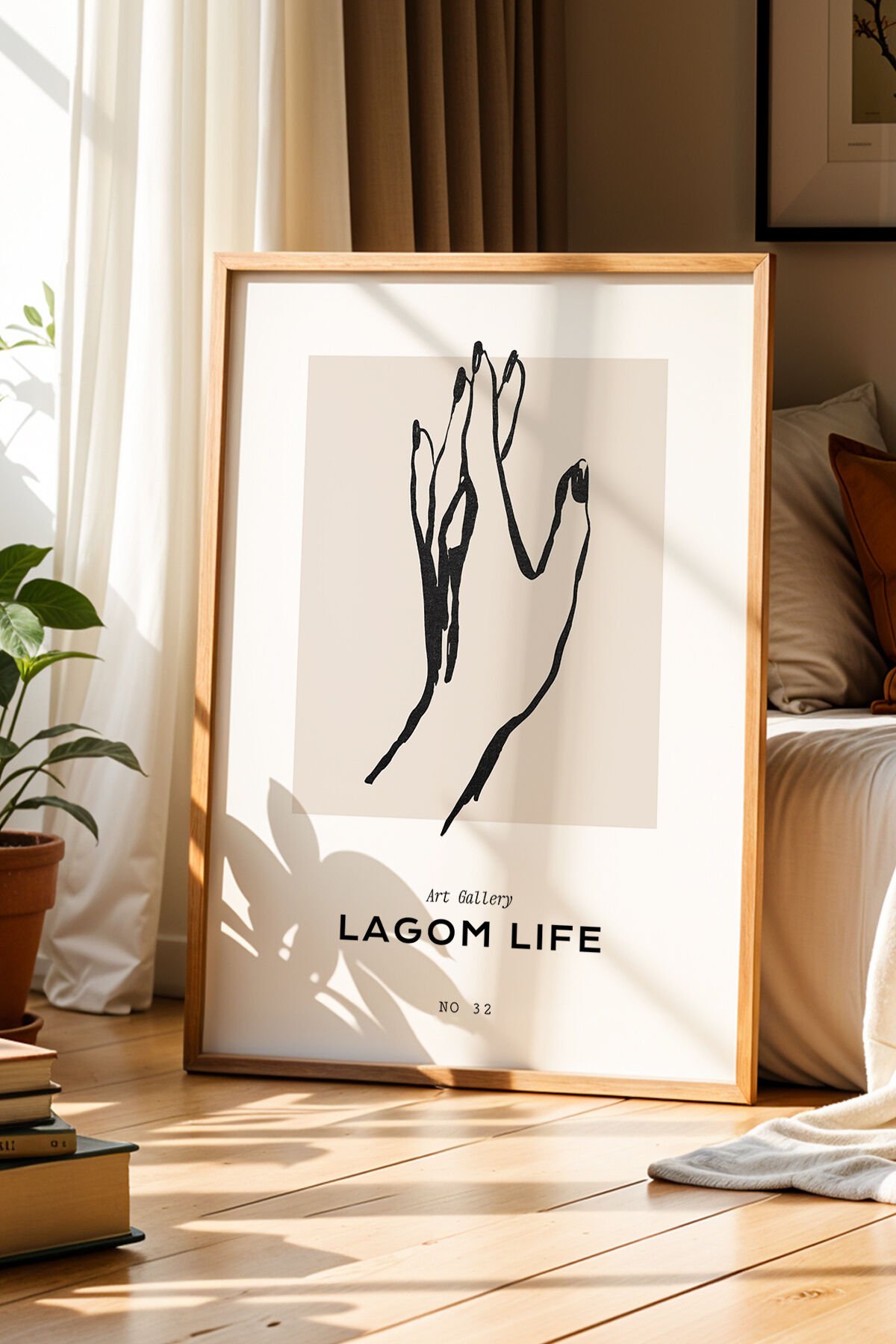DOĞAL AHŞAP - Lagom Life Minimalist El Figürü Doğal Ahşap Çerçeveli Duvar Tablosu