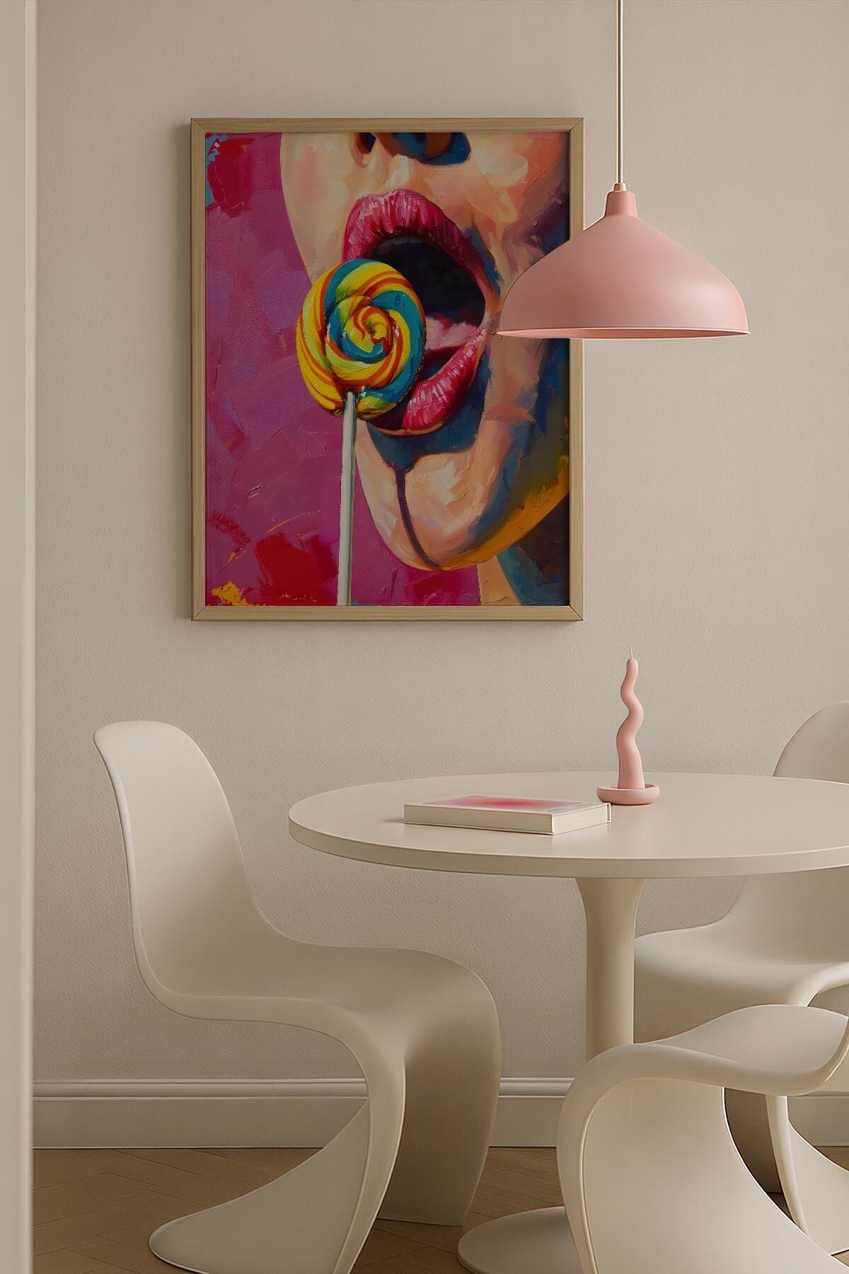 DOĞAL AHŞAP - Lollipop Ağız Renkli Popart Trendy Maksimalist Sanatı Ahşap Çerçeveli Duvar Tablosu