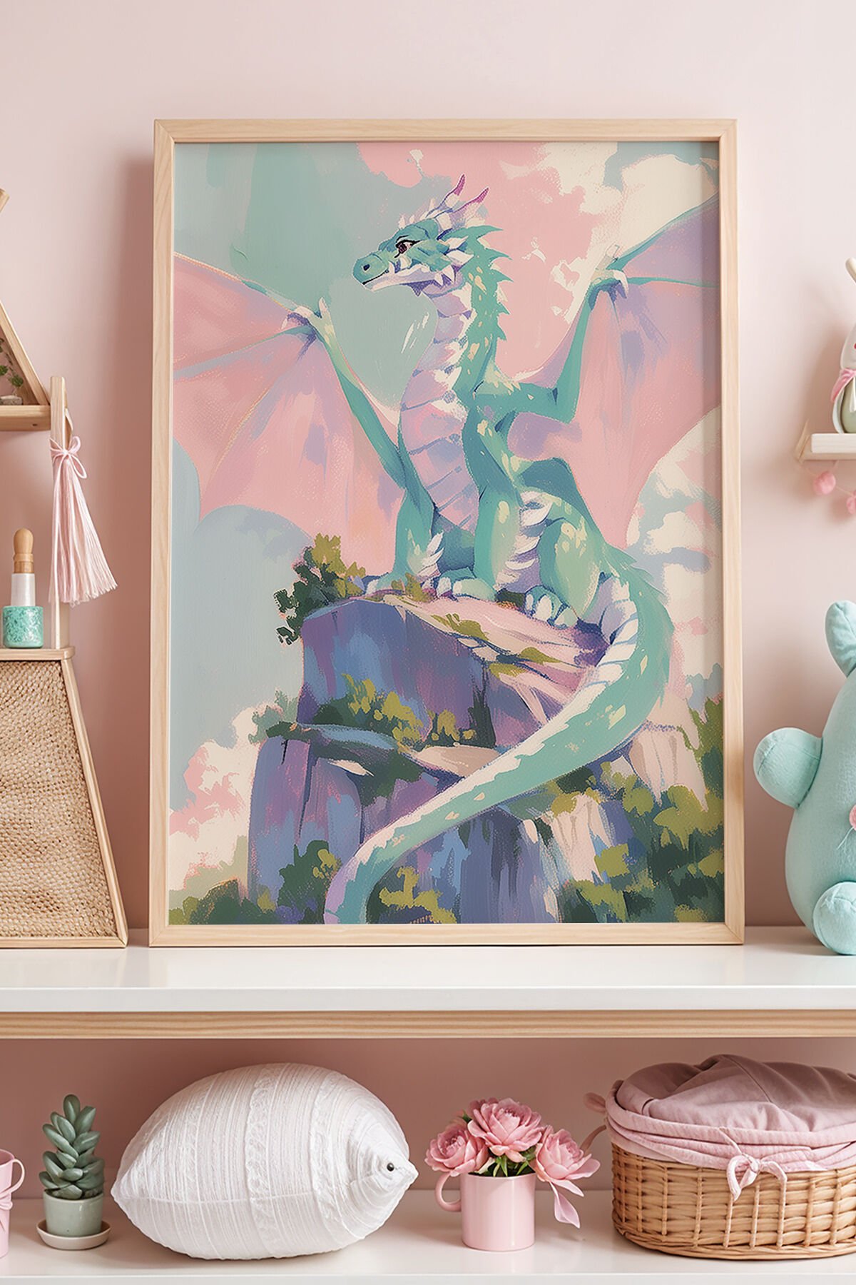 DOĞAL AHŞAP - Masalsı Ejderha ve Dağ Çocuk Odası Ahşap Çerçeveli Duvar Tablosu
