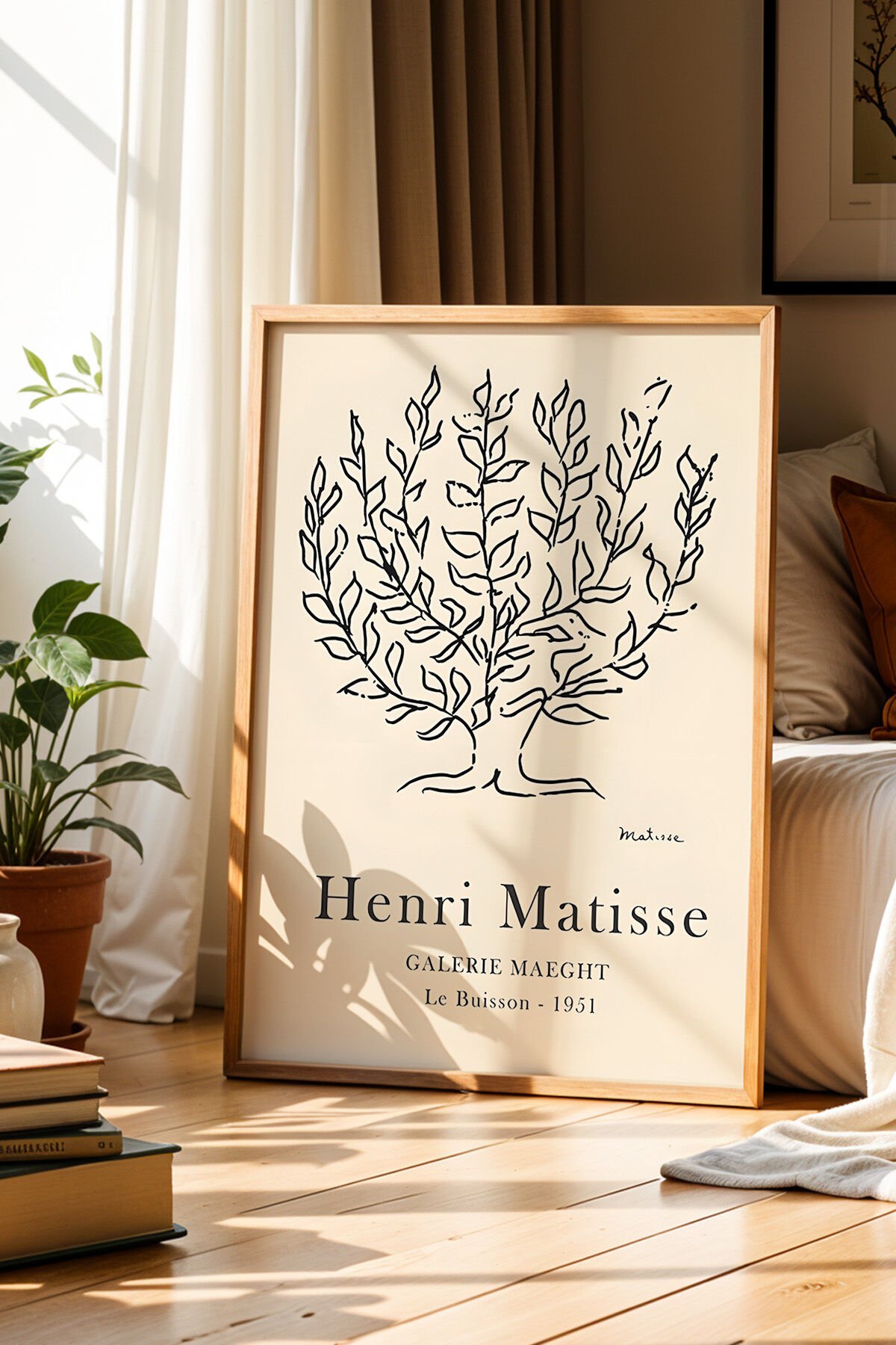 DOĞAL AHŞAP - Matisse Yaprak Desen Bohem Siyah Minimalist Ahşap Çerçeveli Duvar Tablosu